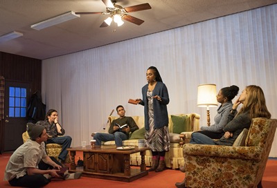 Set in present-day Southern Appalachia (Western North Carolina in the Blue Ridge mountains), St. John's Service House is overseen by Grace (Nicole Lewis), a social worker, and Pastor Hern (Chris Stack), whose oft-mentioned girlfriend, Dahra, remains unseen. Both Cherie (Kristolyn Lloyd), an AP French teacher, and Wade (Kyle Beltran) have been at the house for awhile, Wade for opioid possession and Cherie as a voluntary admit who's in recovery, when Alison (Marin Ireland) arrives at the top of the play. In addition to regular urine screenings, the Service House requires its occupants to hold a job and to do volunteer service work, and we quickly learn Alison will be selling above-ground swimming pools with Wade. As the months pass, Cherie reveals to Alison she's having an internet-romance with a man from Tennessee, and Alison breaks the news that she's going to be allowed to resume her teaching position in early January, three months ahead of her scheduled end-time at the house. But a new arrival, Cole (Peter Mark Kendall) who's also in recovery, sets off an imbalance in the group as sparks fly between him and Alison. Finally, Alison discovers the identity of Cherie's internet-romance and decides to take matters into her own hands with predictably disastrous results. It's easy to recommend Blue Ridge because the performances, particularly Ireland's, are so strong. And it's easy to imagine more forgiving audiences overlooking the lapses in common sense Rosebrock either neglects to recognize or chooses to ignore in her writing. (Warning spoiler alerts ahead.) Subplots involving Wade's contention Hern is racist, and Cole's emotional meltdown when he and Alison finally consummate their attraction to each other, go largely unexamined. And even if you can excuse the complete lack of any credible psychoanalytical treatment for these deeply disturbed people, it's ludicrous to imagine Alison's school would ever allow her to return to her teaching position after first conducting an affair with the principal, and then taking an axe to his Honda in a vengeful rage when he wouldn't leave his wife. It would never happen! Then, in order for Rosebrock to spin her plot forward, she contrives an improbable conversation between Cherie and her on-line suitor that Alison conveniently happens to see and hear. But this contrivance gives Alison the ammunition she needs for the Me-Too upbraiding she gives Cherie's suitor that brings the first act to its fire and brimstone conclusion. It's certainly theatrical, and it's in keeping with Rosebrock's previous works such as Dido of Idaho that was produced last spring at the Ensemble Studio Theater. (Both plays turn on a woman's compulsive allegiance to an unavailable man.) But in Blue Ridge the theatricality is unearned. Indeed, on reflection it feels like Rosebrock's entire play was constructed around Alison's take-down of a man she deems unworthy of her friend's affection. That's undoubtedly true, but it's none of Alison's business and everyone pays a huge price for her meddling in the end. Perhaps if she'd had the help of a competent therapist instead of a sketchy halfway house, Alison's future would be a little brighter.