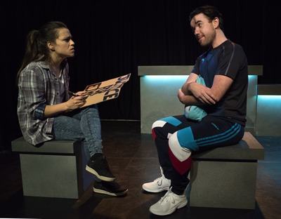 In the parlance of a romantic comedy, Maz (Ms. O'Connor) and Bricks (Ciaran O'Brien) "meet cute" aboard a crowded tram on their way into Dublin. New York commuters will immediately recognize the character of Bricks, a self-absorbed lout gleefully carrying on a loud, obscenity-laden cell phone call in which he is boasting to a pal about a sexual encounter from the night before. Sitting opposite, trying to ignore him and focusing her attention on something she is drawing on her sketch pad, is Maz. Given his puffed-up ego, it's not surprising that Bricks assumes Maz is drawing him, and he pauses his conversation to address her: "I've an awful unsymmetrical face, love; can you make my lazy eye behave itself?" But Maz is not, of course, drawing Bricks, as we soon learn. What she is doing is making a sign to carry in a pro-choice march to be held just prior to a vote to repeal Ireland's anti-abortion law. What emerges from this set-up is not nearly so predictable as you might imagine. When they leave the train, Maz and Bricks go off on separate errands until fate or coincidence brings them back together. What follows is an ambling journey, in which the fronts with which they face the world (her militant seriousness and his overbearing if charming flirtiness) begin to dissolve, and we learn that both are dealing with underlying and unresolved personal pain. Here, the play reveals a richness that one wishes were explored in greater depth. Maz and Bricks, a production of the inventive Fishamble: The New Play Company, emerges from the realm of the Edinburgh Fringe Festival, and there is a certain fringy shagginess to the writing. Ms. O'Connor employs a mixture of political speechifying, romantic interactions, sharp-as-a-tack humor, and sojourns into stylized poetry that suits the character of Bricks more than it does that of Maz. These competing modes make for a bravura juggling act, but they don't always make for smooth connections across styles. Nevertheless, the performances, under Jim Culleton's direction, are quite compelling, and, even with its "work-in-progress" feel, the play presents the opportunity to observe an emerging playwright who is engaged in a quest to hone her voice.