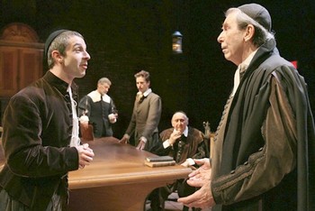 This is not to say that the play, which has been cannily directed by Walter Bobbie, isn't funny. Ives hasn't completely suppressed his natural comic gifts, or his penchant for biting one-liners that somehow draw more laughs than blood. But he hasn't built his play exclusively upon them, rather treated his grave situation, the inquisition of philosopher Baruch de Spinoza over his unique reckonings of the nature of Nature and God, with an overarching lightness that also relieves the play's subjects of the burden of history they're unwittingly assuming. It's as if the play is as unsure about the structure of its being as are the characters themselves. Yet this does not transform New Jerusalem into either a namby-pamby biography or the dusty treatise on the evolution of religious or atheistic thought that Spinoza might seem to inspire. Ives has instead brought together elements of a traditional forbidden romance, a courtroom drama, and a story about a crisis of faith to form a quietly compelling look at how ancient words can forever be interpreted in new ways - and how dangerous that can be to those who put more credence in the words' existence than their meaning. For the play revolves around the attempts of the Jewish Spinoza (Jeremy Strong) to avoid excommunication in Amsterdam of 1656, when he's prosecuted for potential blasphemy by the city's Christian regent (David Garrison) and the rabbi who's long been Spinoza's surrogate father (Richard Easton). Spinoza's conclusions, which recast the Creator as an inescapable element of physical existence, threaten not just the very notion of free will, but the very foundation on which the lives of the two older men - as well as many others in Amsterdam - have been constructed. Ives needs time to chart the full destructive power of Spinoza's wrecking-ball worldview, and skillfully utilizes it in a number of brief but vivid scenes that lead the philosopher from everyday interactions with his friend Simon (Michael Izquierdo) and Christian lover Clara (Natalia Payne) directly into the interrogation chamber. Once he's arrived there, the ensuing hearing achieves its intended edge-of-the-seat dimensions, with fraught confrontations between all the various couplings (including Spinoza and his irritable half-sister, played by Jenn Harris) and the reversals and lengthy speeches that signal the climactic wane of any Earth-spanning story. The play falters only when Ives is unwilling or unable to set aside modern fillips for the sake of the story - elements of espionage, romantic comedy, and even the presence of a selfish, wise-cracking vixen (that would be Harris, giving her usual and expectedly hilarious all) who becomes a convert of consummate importance, interfere with the taut plotting on which most of the narrative thrives. True, the presence of Fyvush Finkel in the somewhat unnecessary role of an influential Jewish elder adds some Yiddish comic flair of questionable cohesive properties, but the actor's gravitas, inherent likability, and staunch professionalism bridge the gap between the centuries in a way that Ives's other convention-shuffling only occasionally does. So, too, does Strong feel out of place, convincing less as an itinerant outsider than as a college-student willing to rouse any rabble necessary to convince others he's more important than he himself actually believes. But he brings such solemnity and conviction to Spinoza, especially in his lengthy dogma-shattering speeches in the second act, that you nonetheless accept him as a respectfully resigned martyr. Garrison and Easton make for powerful yet sympathetic foils, while Izquierdo and Payne wittily circumscribe Spinoza's own contemporaries in ways that paint a startlingly clear picture of how history will propagate itself once the great thinker himself has passed on. This notion of bequeathing and inheriting ideas is what propels the play, and ultimately what helps it succeed as a play about modern issues without needing to openly insult or condescend to any particular point of view. If, as Spinoza says, "True happiness can only come from man's attempt to comprehend God," most of New Jerusalem is substantive enough to create considerable satisfaction of its own.