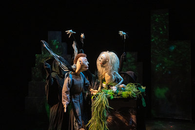 If the idea of theatrical puppetry brings to mind The Lion King, War Horse, or the forthcoming Life of Pi, you are in for a bit of a shock. And, really, do leave the little ones at home. Because, apart from a genial if somewhat befuddled narrator known as the Fox, masked and dressed in a red tuxedo-style jacket over a pair of shorts and sneakers, the play abounds with frightful, potentially nightmare-inducing characters, along with images of war and torture. After some opening remarks to set the scene, the Fox introduces us to Aurelia, a masterpiece of bio-science concocted by her surrogate father, the Turtle. She is, we are told, "part jellyfish, part human, part tardigrade, part turtle, part frog, part axolotl, part naked mole rat, etc. She is also 100% puppet." The Fox makes frequent mention of the fact that the characters are puppets, though this effort at reassurance has zero impact on the play's chilling power. Written and directed by Gwendolyn Warnock and the show's puppet designer Kirjan Waage, "with help from the ensemble," The Immortal Jellyfish Girl touches on some familiar science fiction themes. The year is 2555. Humans, as we know them, no longer exist. The great battle to rule over the Earth is between Homo Technalis, a technologically enhanced version of Homo Sapiens (think "The Borg" from the "Star Trek" universe), and what remains of biological life forms, whose DNA Turtle has used to create Aurelia. Will Aurelia, with the help of some friends, especially Bug (a flying insect and romantic interest), be able to maneuver her way through the radioactive war-torn fields to what remains of the life-giving ocean? Or will all life as we know it be consumed by the Technalis, ruled over by Doyenne, frightfully depicted in the form of a disembodied head and arm? The answer is never made entirely clear, as the play offers us alternative endings. Depending on your degree of cynicism or optimism, choose your own. The Immortal Jellyfish Girl, running 80 minutes, is an exceptionally theatrical piece of puppetry, and everyone involved in the production should be credited for this grand collaborative effort. The performers behind the puppets are Lei-Lei Bavoil, Alexander Burnett, François Couder, Dorothy James, Andy Manjuck, Peter Russo, Kirjan Waage, Gwendolyn Warnock, and Olivia Zerphy, with Jon Levin and Kyra Vandenenden identified as additional members of the ensemble. The visual and auditory design elements are likewise essential to the production's success, with Thor Gunnar Thorvaldsson responsible for the original music and sound design, Jan Erik Skarby with Marianne Thallaug Wedset responsible for the lighting, and Erato Tzavara in charge of the projection design. And finally, the amazing flyaway set design and costumes are by the writing/directing pair, Gwendolyn Warnock and Kirjan Waage. Bravo to all involved in the creation and performance of The Immortal Jellyfish Girl. It is a stunningly original theatrical work. The Immortal Jellyfish Girl