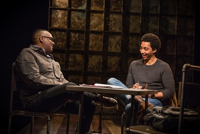 Another crackling good playlet is "The Interview," which will no doubt be presented in future acting and scene study curricula. Playwright Manning performs the part of Brandon, a presumably charismatic black preacher, and who is in a coffee shop waiting for a friend. Eddie K. Robinson is Eddie, an energetic college student, who knows practically every detail about the church leader. Is the meeting of the two men purely by chance after all? The actors are outstanding, and as the scene takes several fascinating twists and turns, the stakes grow uncomfortably high and the power dynamic keeps shifting. The less successful playlets are those that forefront the issues rather than introduce fully drawn and compelling characters. "The N' Connection" and "The Date," for example, both highlight nonchalant racism by sexist white male characters, and the exchanges between the characters telegraph the plot twists within the first few minutes of each vignette. Chika Shimizu's scenic design, Daisy Long's lighting, and Everett Clark's costumes allow for quick transitions, and maximize the power of the writing and the performances. Matt Otto's sound design, which includes broadcasts and commentary from a radio DJ, is deliberately jarring and intrusive. The transitional announcements serve to provide a reminder of media noise behind the quieter personal stories, and highlight the notion that Manning and company have proffered a Living Newspaper for the 21st century.