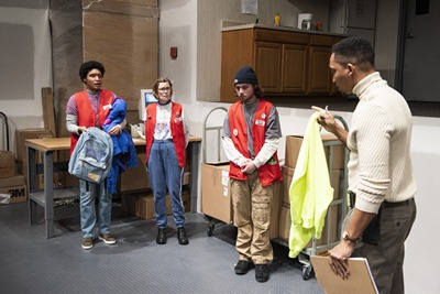 Set in 1995 in the fictional town of Paris, Vermont, the play opens with Emmie (Jules Latimer) in a nerve-racking interview with Gar (Eddie K. Robinson) for an hourly position working at Berry's, a dollar-type discount store. Emmie has a serious cut on her left cheek that's covered by a bandage, but it's clear she's had some sort of accident. Gar, who has risen through the ranks at Berry's from the stock room to management, is an off-putting interviewer with a cruel sense of humor. But he hires Emmie at five dollars an hour and she's thrilled to have a second job augmenting her existing one serving drinks at a local bar. During their interview, an older worker named Dev (James Murtaugh) bursts into the employee break room intent on getting first Gar and then Emmie to join his get-rich-quick pyramid scheme, but Gar sends him packing. Quickly, Emmie sees firsthand that the dysfunction level of everyone at Berry's is pretty high. Emmie is off to a shaky start as she interacts with coworkers Logan (Christopher Dylan White), a young, wannabe rapper, and the older Wendy (Ann McDonough), who we learn is married to Dev. While unpacking and pricing sweatshirts, Emmie damages one of the sweatshirts and, when Gar arrives unexpectedly, Logan and Wendy concoct a preposterous lie to cover for her. Emmie goes along with the deception, but Gar knows their story is a fabrication. Rounding out Emmie's coworkers is Maxine (Danielle Skraastad), a single mother with four kids who lives in a motel room and has an axe to grind with everyone and everything.