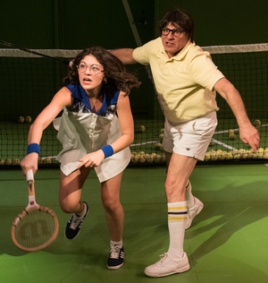 On the face of it, the actual primetime televised encounter at the Houston Astrodome was little more than an absurd publicity stunt promulgated by Mr. Riggs, a self-styled hustler, "male chauvinist pig," and pretty much an outdated player in the realm of professional tennis. Although he had once been a formidable competitor and had won Wimbledon back in 1939, it was now more than three decades later. Riggs was 55 years old and well past his prime when he challenged the 29-year-old, still very active women's tennis pro Billie Jean King to the $100,000 winner-take-all contest. For all of Riggs's chest-beating brouhaha, in the end Ms. King handily won in three straight sets. With it's double-entendre title, Balls quickly sets us up for the expected theme in which men are know-it-all idiots, while capable and competent women are forced to prove themselves repeatedly. That the production coincides with the rapidly re-emerging women's rights movement only adds to its significance. But there is much more here than the re-creation of the match, itself so marvelously choreographed by movement director Natalie Lomonte. Balls is a work of consummate collaboration that not only immerses us in the sights and sounds we would have encountered at the Astrodome, but also places that singular moment within its historic context. There's a lot to explore in 85 minutes, as counted down minute-by-minute on the overhanging scoreboard. The play's co-authors, Bryony Lavery and Kevin Armento, move well beyond a case study of sexism to incorporate issues of reproductive rights (the Roe v Wade decision came out that same year), sexual orientation, gender identity, racism, and ageism. Between King and Riggs alone, the competitors' lives cover all the bases except for racism and gender identity, though the production manages to bring these in as well. We're told, for example, that "Althea Gibson, the first professional African American tennis player, wonders when there will be a match symbolic of her equality." There's also a passing reference to Renée Richards, a transgender woman and tennis player who was denied entry into the U. S. Opens not long after the King/Riggs event. So, yes, brace yourself for a dizzying onslaught of content. As you enter the theater, you will see that it has been set up to suggest we are at the Astrodome. Each seat has covers that match those of the stadium, and Kristen Robinson's compact tennis-court set, the bright lighting provided by Mike Riggs, and the terrific sound work of Brendan Aanes that perfectly captures the whoosh and thwack of the tennis balls make for an all-encompassing theatrical design. Sometimes you'll watch King and Riggs engaged in back-and-forth volleys; sometimes you'll see only one side of the game (and listen to the player's self-talk); and sometimes you'll see things from the ball's perspective. You will also hear interesting tidbits about the game of tennis itself or even about events that are going on in the outside world, like the fact that Monica Seles and Monica Lewinsky were both born in that same year. All in all, this is an exceptionally well-wrought ensemble piece, intricate enough to require two directors (Ianthe Demos and Nick Flint), as well as two production companies behind it (One Year Lease Theater Company and Stages Repertory Theatre). That the co-playwrights and the co-directors are made up of female/male teams does not seem coincidental, given the nature of the work and the other pairings in the play. In addition to the stars in the center court (Ellen Tamaki as Billie Jean and Donald Corren as Bobby), we've got Cherry (Cristina Pitter) and Terry (Danny Bernardy), rowdy brother/sister fans hanging out in the stands, stuffing their faces with popcorn and candy, and cheering opposite sides. There is also the ongoing saga of the ballgirl (Elisha Mudly) and ballboy (Alex J. Gould), whose lives we follow both within and outside of the time of the match, from their high school days through a marriage, divorce, and beyond. Oh, and we mustn't forget the two tennis clowns, Olivia McGiff and Richard Saudek. Finally, rounding out the pairs are Billie Jean's husband Larry (Danté Jeanfelix) and Billie Jean's hairstylist and secret lover Marilyn (Zakiya Iman Markland). The former would spill the beans about his wife's abortion, while the latter would wind up outing their relationship in a palimony lawsuit following their breakup. High drama, indeed! Ultimately, there may be little more to glean than what we already know about this moment in history, this half-joking, half-serious tennis match from 44 years ago. Bobby Riggs died in 1995, while Billie Jean King remains a potent figure in the fight for equality for women. Balls may be merely another piece of the spectacle, but you'll be hard pressed to find a better retelling of a story that has obtained near-mythic status as "The Battle of the Sexes."