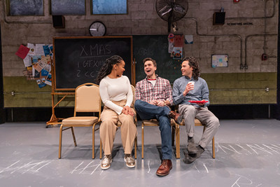 Actor Joe Tapper, who has been public about his own struggles with alcohol abuse, portrays Steven, the protagonist representing Daniels. Steven, too, is a theatremaker; as the character renders the rise of both his performing arts career and his alcoholism, he cites several well-known alcoholic playwrights, including Williams, Albee, and O'Neill, musing "What if living like this is what makes me an artist? What if I'm nothing without it?" Tapper is reprising the role five years after his performance in The White Chip at 59E59 Theaters. He plays Steven with such intense, raw authenticity that it feels like he could have authored the show. The seeming inseparability of Daniels, Tapper, and Steven underscores the universality of this powerful, confessional play. Crystal Dickinson and Jason Tam portray parents, friends, colleagues, coworkers, and others in Steven's direct address narrative, constantly morphing through multiple roles, spanning dozens of identities, ages, cultures, and conditions. In the first few minutes alone, Tam is a convincing explicator of Mormon baptismal practices, a mischievous 12-year-old, a drunk college chum, prison warden, boss, and father afflicted with Parkinson's. Dickinson brings wild amounts of humor and marvelous depth to Steven's lovers, friends, and fellow alcoholic mother. To achieve the transformations, the company pulls props and essential wardrobe elements (costumes by Devario Simmons) from cubby cases flanking the acting area, mediated by a reversible chalkboard on and beyond which characters scrawl key phrases to signal shifts in action and intention. The scenic design is by Lawrence E. Moten III, lit by overhead utility lamps and bursts of color through grimy transom windows high on the upstage cinderblock wall (lighting by Abigail Hoke-Brady). Escaping the workshop-style meeting room appears nearly impossible. Sheryl Kaller's direction exploits epic techniques to reveal the artifice behind the illusion. The White Chip works to simultaneously dispel the magic behind both alcohol consumption and theatrical entertainment. The show's title comes from the white chip that is the first in a sequence of small, round tokens signifying sobriety milestones throughout the Alcoholics Anonymous recovery process. Though Steven keeps declaring a desire to stop drinking, chronic relapses lead to his infinite accumulation of white chips that strand him stumbling at step one. In a clever dramatization of this elliptical torture, Tam and Dickinson trap Steven transferring tokens between two fishbowls brimming with white chips while mocked by a "Yakety Sax" soundtrack (sound design by Leon Rothenberg). In the background, a subtle feature of Moten's set is an analog wall clock stopped at 12:04 but with an endlessly rotating second hand, spinning yet stuck. The circular cycle gives way to Steven's road to recovery when he meets a pair of climactic characters who explain the chemistry behind dependency. The White Chip interlaces themes of religion, alcoholism, and theatremaking in ways that give the piece a strong structural continuity and brings about a satisfying, informative resolution. Steven's confessional narrative reveals the innermost machinations of the suffering mind, making it clear that anyone can fall victim to addiction. Sean Daniels aims to erase stigmas, emphasizing that "The arts will play a leading role in changing the narrative of the public health crisis that is addiction in our country." Past productions across the nation have made it free for recovery centers to attend. Here, a program insert encourages spectators to "stay dry after the show" with a list of where to find quality mocktails in bars and restaurants in the immediate Hell's Kitchen neighborhood. The White Chip proves to be a potent piece that moves audiences while educating us about addiction. This show may very well save lives.