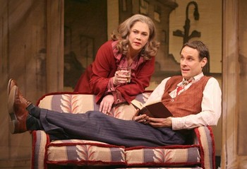 Judging by this play, Busch is currently mired somewhere between stories one and two. While he might have some worthwhile things to say about parents and children, he spends far too much time stating and restating them to ever actually communicate anything. Of the four stories that collide here like a four-car freeway pileup, none merits even so much as momentary rubbernecking. That Busch, the reigning monarch of elegant Off-Broadway camp, could derive such dreariness from such a potentially juicy subject as Hollywood's obsession with treacly family topics shoehorned into any genre is as unfortunate as it is unexpected. When he wants to, Busch can absorb and exude raw and honest - if oversize - maternalism; he demonstrated this as recently as late 2007 with a revival of his female-empowerment spoof Die Mommie Die!. He does, however, need both a point and the wisdom to not make it 20 times if once will suffice; he displays neither with The Third Story. Instead, he conjures up an Omaha house in 1949 to serve as the epicenter for a quartet of woozy flights of fancy, three of which two faded writers design to return themselves to prominence. The son, Drew (Jonathan Walker), is brilliant but unambitious; he's given up on women and writing, and is content to live out his life as a postman. His maybe-blacklisted mother, Peg (Kathleen Turner), however, insists he get back on as many horses as possible, if only so she'll be able to come along for a ride.