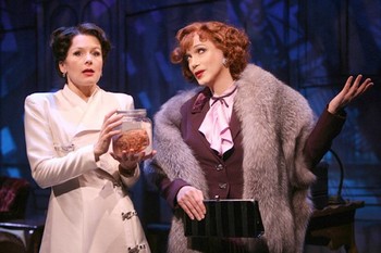 With critical plot threads (frequently involving parental dissatisfaction and mistaken identity) appearing over and over, any two of these stories might have made a complete play by themselves. But Drew and Peg rehashing their rivalries and expiating their stressors three times over is simply overkill in a play with so little on its mind. Because Drew and Peg have little substance outside their creations, and because their characters must all share the stage with each other, the overall effect is one of reading single pages at random from a half-dozen different books. So even when Drew and Peg's relationship becomes the evening's dramatic anchor, the play is never moving. And because, unlike much of Busch's frothier work, the characters aren't developed past the storyboard stage, the play is almost never funny. Busch's unblinking, camera-fellating takes are, as always, good for a chuckle or two, especially when kitted up as the mafia matron; and Van Dyck fashions a vivid comic caricature of her eerily sexy scientist, especially sinking her claws into a howlingly pulpy speech explaining both her fear of children and her own unnatural experience with twins. Everyone else comes across more eggy than they do hard-boiled. This includes Turner, who brings an appropriate mannishness to her emasculating role, but with her slurred speech and pensive-to-the-point-of-forgetful line readings seems to be gearing up for a revival of her 2005 revival of Who's Afraid of Virginia Woolf?. As Peg, she never radiates gossip-drenched Old Hollywood; but she's more convincing than she is as Constance's cohort and confidante, Dr. Rutenspitz, created only (and barely) by a pair of thick classes and a German accent approximate enough to fail slicing through sauerkraut. Part of the problem is director Carl Andress, who shows more flair in setting up individual "shots" than he does in editing them into a complete picture of mother-and-child pairing, let alone four. But the real troublemaker is Busch, who in giving Andress too much has in effect given him nothing. Matters don't improve even in the final moments, when Peg and Drew's various climactic revelations come as a surprise less because of their emotional content than because they're supported by so little. Busch may see in all his fairy tales here analogues for the troubled interactions between the generations, but any parallels come across only as functions of a play that is itself too flighty to ever mature properly.