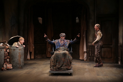 Charlie Corcoran's set is suitably bleak: what looks like an upstage castle parapet with high, small windows peering out on a monochromatic gray horizon, and a downstage armchair populated by Hamm (John Douglas Thompson), abutting two trash cans, in which reside his two legless parents, Nagg (Joe Grifasi) and Nell (Patrice Johnson Chevannes), with dislodged bricks spilling out between them. It's a dispiriting landscape for Clov (Bill Irwin) to intrude upon. Cursed by a barely functioning left leg, which Beckett never bothers to explain, Clov does Hamm's voluminous bidding with a variety of resignation, willingness and bitterness. There's considerable music in Irwin's delivery, and a generous sampling of his long-germinating clown skills; he can turn his face into masks representing the gods of comedy and tragedy without trying. And he moves so gracefully, even with Clov's bum gam, he's a pleasure just to watch. There's music in Thompson's delivery, too; his voice, we know from past performances, is a versatile instrument. But he's tasked with more of Beckett's taxing, contradictory epithets: "The bigger a man is, the fuller he is. And the emptier," and such. As Hamm is blind, and his eyes are almost always covered with enormous sunglasses, that voice will be taxed to the max to provide variety where facial expression cannot. This Thompson can do. But you won't understand everything he says, and maybe you're not supposed to. The non sequiturs fly thick and fast: "Why don't you kill me?"; "I don't know the combination of the cupboard." We gather that what's out beyond those windows is wasteland, and whether we're in an actual physical world, or just Beckett's mottled imagination, is for us to decide. And plot, forget it. Endgame is a series of confrontations, many nonsensical, that actively resist forward motion. Absurdity piles upon absurdity, with Hamm coveting, then hurling away, the three-legged stuffed dog he claims as a pet, and Clov furnishing whatever mind-bending humor Beckett provided. Hamm: "What time is it?" Clov: "The same as usual." There's welcome punctuation from Nagg and Nell, who divert all too briefly with reminiscences of a happier past and musings about a benighted present and future, if any. Grifasi, the program notes, has been associated with Endgame for a half-century, and he has the Beckett rhythms, and anomie, down patespecially when retelling a still-funny joke about the creation of the world versus the creation of a pair of trousers. And Chevannes is such a lively Nell, with such a ringing delivery, you only wish Beckett allowed her to pop up out of that trash can more often. But it's swiftly back to the frazzled Clov taking care of the demanding Hamm, the cryptic repetitions, the inexorable push toward the endgame, be it literal or metaphorical, and the stressing of the pointlessness of existence. Director Ciarán O'Reilly keeps it moving, though Beckett's stage directions are so exacting, it's not clear how much he really had to do. Michael Gottlieb's lighting is appropriately depressing, and M. Florian Staab combines some fetching "Thus Spake Zarathustra"-like music with a sound design so welcomely natural, I'm not even sure there are any mics up there. Samuel Beckett terrifies me, so you may wish to look elsewhere for a more authoritative analysis of this Endgame measured against others. To these eyes, it's a more than competent production, and if you're already partial to the author's cold emotional landscape and mystifying existential abstractions, you'll probably eat it up. The rest of us may choose to side with Hamm, who opines at one point early on, "This is not much fun." Endgame