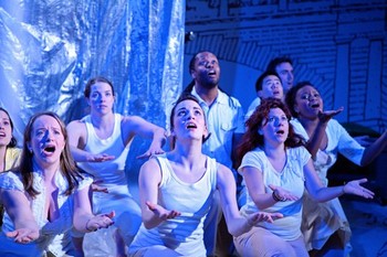 That problem never abates during the course of this listless almost-musical which, despite counting contributions from a dozen or so dramatists from the spoken- and musical-theatre realms, displays few distinguishing features other than the theater's moderately impressive ceiling. This show may have been inspired by concepts of eternity as they relate to religion, humanity, and the very art of the theatre, but its languid attempts to convey their perennial urgency are not especially inspiring in turn. Conceived and "curated" by Prospect's Producing Artistic Director Cara Reichel, The Dome combines, collides, and confuses three large stories and several smaller ones without making much sense of any of them. In "Hypothesis," written by Laura Marks and directed by Stefanie Sertich, Voltaire and his lover Emilie du Châtelet (Dino Antoniou and Dorothy Abrahams) bicker between romantic romps about the complex interplay and competition between God and science. "Hey Baby" (music and lyrics by Marisa Michelson, book and lyrics by Rinne Groff, direction by May Adrales) finds a young couple (John Gardner and Kathryn Holtkamp) preparing and overpreparing for the birth of their first child. Two custodians, Martin and Missy (Andrew Zimmerman and Sarah Bowles), romp through writer-director David A. Miller's "Break Time," musing on the nature of the West End Theatre and their burgeoning non-relationship relationship. Several "Monologues" by Norman Lasca examine from a cosmic perspective everyday topics such as acoustic theory, shoes, and Giants Stadium. In between, there's no shortage of clowning both literal and figurative: Kyle Williams and Jesse Kearney traipse through a wordless comic reenvisioning of Martin and Missy's story; other cast members are given to tossing about paper airplanes or beach balls. A couple of lovely standalone songs, one about the dome itself (written by Michael L. Cooper and Hyeyoung Kim) and another a serious-minded "Saga of Jenny"-style rumination on a girl named "Liliana" (penned by Deborah Abramson), also enhance the unpredictable playfulness, reminding you this is a venue and a show in which anything can happen. Except, really, nothing does. Though Reichel is a director of considerable invention, as she's demonstrated in shows with her husband Peter Mills (The Pursuit of Persephone, The Rockae) or others (The Book of the Dun Cow, in this same theater three years ago), here she just seems to be overreaching. In trying to unite so many diverse and dangerously disparate works in celebration of Prospect's 10th anniversary, she's made them even more isolated, and any connections between the individual compositions, the writings and the space, or even the theater and the supposed overarching theme are tenuous at best. This makes nearly everything more arid than universally significant. Abrahams is handsome and confident as the ahead-of-her time Emilie, and Bowles is thoroughly charming as the vaguely tomboyish Missy. Most of the other performances strain in feigning innocence or simplicity, or bloat in pretending to be unadorned; even Williams and Kearney are more wearying than wry, their characters' presence more stylistically jarring than comedically necessary. The design scheme is similarly troubled: While Emily Deangelis's costumes are elaborately adequate, Meredith Ries's astrolabe-meets-Da-Vinci-spec-drawing set is intensely lifeless, Evan Purcell's lighting pointlessly portentous, and Richard Dibella's video too often obligatory. It's Dibella's work, by the way, that's most frequently employed to guide your gaze upward, usually with films of scientific sketches, starscapes, or other notable phenomena. At one point, he even depicts the moment of conception - as seen from inside the womb, of course. This is intended, no doubt, as a reminder that the grandest of concepts ultimately all derive from the same tiny place. The ideas Reichel and her collaborators are tackling might be appropriately galaxy-spanning, but as realized here they're not large enough to fill either the dome nor The Dome.