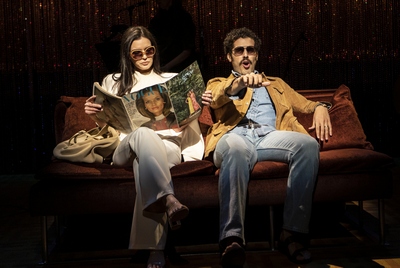 Chief among these is the cast under Scott Elliott's fluid direction. (Kelly Devine did the musical staging.) Damiano is a force of nature with a voice to match as the woman who changes the matrimonial rules. Pérez brings just the right balance of swagger and vulnerability to a man in his thirties trying to hold onto the grooviness of one in his twenties. As the uptight attorney Ted, Zegen (playing a very different character than he does as Mrs. Maisel's husband on television) is charmingly awkward. Nogueira is delightful as the most repressed character of the quartet, who finds herself caught up in a shifting moral landscape. As the Band Leader, Vega, both to her credit and disadvantage, tends to disappear into the musical backdrop. The show also boasts outta sight production elements. Derek McLane's scenic design playfully captures the 1960s milieu without overdoing it, and with the assistance of Jeff Croiter's lighting, the action effortlessly moves from one locale to the next. Thankfully, Jeff Mahshie's wonderful costumes do not exhibit comparable restraint. (Ted's checkered pants must be seen to be believed.) Bob & Carol & Ted & Alice is an ambitious musical, but sadly, its appeal is as lasting as a one-night stand.