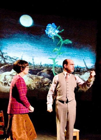 This show by Jim and Ruth Bauer that's being produced by the Prospect Theater Company is no rock musical, though it threatens to blow out the walls of the tiny West End Theatre it's housed in. You won't find a trace of camp within its impossibly brisk 140-minute running time, though it's also one of the funniest new musicals New York has seen in several seasons. And it's not based on a famous movie or a catalog of pre-sold pop songs, even if most of what you see and hear feels as familiar as the enveloping embrace of an old friend. No, The Blue Flower is, as much as it can be classified as any one thing, one of the decade's most eclectically electric explorations of theatre's potential to unite all the arts within a single heartbeat. This modern Dadaistic masterpiece fuses together the Weimar Republic, the United States, the two World Wars they had in common and the musical styles they didn't, and the unpredictable yet irresistible pulse of a video-art installation to create an show that behaves, sounds, and feels like no other. So don't be surprised if a guitar's harsh country twang melts into a direct melodic quotation from another famous Weimar musical. Or if a Dada performance artist and her ghoulish backup singers force you into a sing-along with some of the most carefully constructed nonsense syllables you've ever heard. Or if you're brought to tears by the sudden dissolution of a relationship or a life that, mere minutes earlier, seemed to be fixtures no less permanent than the Alps. The only certainty is that nothing is definite. Unexpected connections between the Eiffel Tower and figures as apparently disparate as Prince Rudolph of Austria, Adolf Hitler, and contemporary Renaissance man Max Baumann (played here by Marcus Neville) can be as simple as their lives all ending or beginning in 1889, or as complex as the threads of time that keep linking the four together throughout the first few decades of the 20th century.