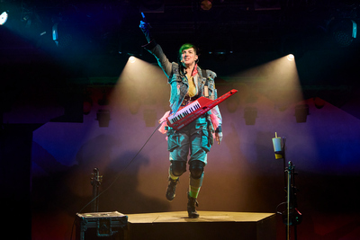Up until that point, the (mostly) solo musical with a book co-authored by Bitch and director Margie Zohn, utilizing the performer's song catalogue (music and lyrics by Bitch, with contributions from other artists), has been a celebration of the rise of a shy, marginalized girl from Michigan finding her voice and, through her music, fashion and moxie, encouraging other shy marginalized people to do the same. And if it had stayed that way, B*tchcraft would certainly be recommended as a lively and uplifting 80 minutes of theatre. But the part of her story the star doesn't really want to talk about involves the fall–a deep fall involving accusations of being on the wrong side of a human rights issue that has become increasingly more relevant in the past few weeks. And that makes B*tchcraft a musical play not only to be enjoyed, but to be discussed, debated and admired for the artist's bravery in standing center stage and defending her truth. But we'll get back to that. Projection designer Brian Pacelli sets the mood upon entering the theater, with the walls decorated in a colorful collage of 1980s spiral notebooks emblazoned with animal illustrations and slogans like "Girls Rule", calling to mind the adolescent-aimed commercial art of Lisa Frank. Scenic and prop designer Samantha Tutasi has placed a mythical-looking music stand upstage, with a giant pencil hanging above. The play begins with a silent character designated as The Crone (Cary Curran) conjuring up "Li'l Bitch" (known in her youth as Karen Mould) from a sandbox. "I was a quiet child," she sings while describing growing up with a father whose only use for her was an ability to pour a proper beer and a mother who burdened her with her own frustrations of not becoming a Broadway star. (Sound designer Sean Hagerty supplies voiceovers for these and other supporting characters.) Seems her only real friend growing up was a stuffed Beaver, played silently in enthusiastic life-sized form by Francesca. Projections display Karen's playfully colorful childhood bedroom, but when the angst and anger of the awkward child take over, the walls explode with the animated black and white drawings of an artist needing to burst free. Some of that freedom is expressed by taking classes in her mother's basement tap dance studio (choreography by Michelle Dorrance), but her real passion is set loose when she starts learning to play the violin. As a college theatre major, she fulfills an academic requirement with Women's Studies 101 ("Your homework for this week is to watch every second of the Anita Hill hearing and try not to throw things at the screen.") and learns that much of her teenage awkwardness came from attempting to minimize her large presence to satisfy the male gaze. This is also where she meets "wild child New Yorker" Danny, "this tough-looking hot possibly a lesbian boy girl that I couldn't stop staring at for the whole class." Soon Karen and Danny are a loud and boisterously pro-pussy music duo touring the country's queer-friendly venues and Pride celebrations in a tour bus named Camp TWAT (Tenacious Women And Transfolk) as Bitch and Animal, making up new names for the states they play along the way. ("Hello, MissesLicked Me! As you may or may not know, we were kicked out of South Carovagina last night!") While Bitch displays engaging and endearing musical comedy storytelling chops during the show's initial scenes, her recreations of concert appearances demonstrate the frenzied display of ferocity that encouraged her fans to use self-empowerment and non-conformity as a weapon against those who would limit the space they occupy. ("This song goes out to all the inbetweenie-weenies out there!") Costume designer Andrea Lauer has Bitch's wardrobe evolve from an ill-fitting display of 1980s pop-femininity to sleek and stylish war gear. Bitch pounds the floor into submission with forcefully executed time steps, attacks the strings of her electric violin and fingers the ivories of her strap-on keytar while performing anthem rock selections like "Pussy Manifesto," a call and response number that sucks the negative connotation out of the word, and "You're the Man," a condemnation of patriarchal corporate warmongering. Though Bitch and Animal are used to dealing with the indignities they encounter in straight society, they're enraged by the sexism they're made to endure while performing in Provincetown and male-run Pride events, so an invitation to perform at the Michigan Womyn's Music Festival, a week-long event that was held annually for 40 years, is an exciting opportunity. "Started in the 1970s as part of a separatist movement of radical lesbians, wanting to make their own space and celebrate their own culture," explains Bitch. But even as she and Animal are introduced onstage as having "a specific voice that is challenging us to be more wild, more gender expansive, and more authentically ourselves," there are protesters from Camp Trans denouncing the festival for practicing exclusion and labeling any act that plays there as TERFs. While one voice insists, "Bitch, you need to stand up for the marginalized. You need to say from the festival main stage that you denounce the policy of excluding trans women," another explains, "This festival is the one place all year where I don't have to see or even think about a penis," and asks, "Why do they want to take that away from me?" "I am trans," shouts Animal, and Bitch cites the pro-trans songs they've been performing, but more and more protesters start showing up at their performances and when an incomplete quote given by Bitch is interpreted as proving that she regards trans women as being men and goes viral, gigs start getting cancelled and her music career completely stops. As a cis male, I recognize that there are people far more qualified than me to write about this issue, but as a theatre critic who took on an assignment to review a show, I'll opine that Bitch sympathetically expresses her empath