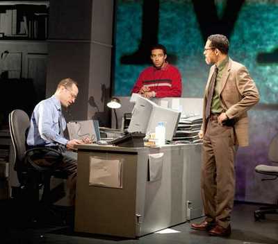 You would think, then, that Gabe McKinley's new play about this controversy, CQ/CX, which the Atlantic Theater Company is presenting at Peter Norton Space, would be a top-to-bottom lean-forward thriller. But you would be wrong. It's many thingsinformative, well directed (by David Leveaux), well designed, and reasonably well actedbut exciting it is not. One can't help but wonder if this is because McKinley was too close to it all. A news assistant at the time Blair was making his name and making up things, McKinley was undoubtedly near enough to the action and its anti-hero to become intrigued and affected by the experience. But his play is so lacking in conclusions, details, and, well, drama, that it's not clear how close he actually was, or how close he wanted to be. CQ/CX is so determined to treat everyone involved with respect, and borderline fawning admiration, that it fails to make its points with any piercing precision. If you've read the astonishing 7,200-word Times chronicle about the affair, "Correcting the Record," you will discover nothing new in McKinley's play; in fact, the newspaper version is in every way more vivid, tense, and unpredictable. This isn't just because it uses the real names that McKinley doesn't; the playwright changes Blair to Jay Bennett (a role played by Kobi Libii), Executive Editor Howell Raines to Hal Martin (Arliss Howard), Publisher Arthur Ochs Sulzberger Jr. to simply Junior (David Pittu), and created two composite characters, one (Ben, played by Tim Hopper) that fuses together Blair's disapproving editors and one (Gerald, played by Peter Jay Fernandez) encompassing the folks who kept pushing their charge further up the ladder (and, to lend weight to the racial subplot, is black). This was, for better or worse, to be expected. But the vacant, cipher-like nature of Jay is the key thing McKinley should have corrected but didn't. We see Jay struggling over copy and pondering his piling-up corrections, we see him begin to exercise more "creative" writing, we see him socialize with his on-the-rise friends Jacob (Steve Rosen) and Monica (Sheila Tapia). But we don't see inside him. Aside from one private conversation with Gerald, the impact of the Times' race policies barely plays role, yet is somehow eventually inflated into a major concern. Worse, we're given too little information about Jay's background and personality to derive other motives, and the second act (set after the September 11, 2001 terror attacks, when the biggest problems started) is so sketchily written that we learn nothing new. At its climax, when Jacob begs Jay to explain himself, the only answer McKinley bothers providing is: "You'll have to buy the book." Even if the real Blair reacted essentially the same way with his memoir, Burning Down My Masters' House, it's a deeply unsatisfying wrap-up for such a significant chunk of the play. Far more involving is the Junior-Hal-Gerald trio that provides the higher-elevation element to this Upstairs, Downstairs saga. As the three men try to deny problems, then are forced to embrace them, and then trudge through the devastating aftermath, you see exactly what was at stake for this institution, and what the larger implications were. You get a different perspective with the final character, an 40-year veteran Timesman named Frank (Larry Bryggman), who represents the "old ways" that are dying off in the new age. The matter of what the Times was in the process of losing is a fascinating facet of the story that's never before been explored. But it is only half the story, and despite intricate acting from Pittu (all business in the first act and all tragedy in the second), the matter-of-fact Howard, the walking-on-glass Fernandez, and the charmingly neurotic Bryggman, it's not enough. Libii is adequate as Jay, likeable on the surface but in no way enriching his hollow shell of a role. Rosen and Tapia are both delightful, but underused as Jay's undersung victims. The most successful portrayal comes from Hopper, whose Ben acts as a Cassandra-like sage that predicts the ruin to come but whose warnings fall upon deaf ears. (It's more than a little telling that, after a magnetic pre-intermission showing, Hopper has some three lines in Act II.) Leveaux deserves plentiful kudos for bringing out every drop of tension in the script with a kinetic, pulsating staging that thrusts you between potentially staid newsroom settings, nondescript dive bars, and hotel rooms at jet speed. David Rockwell's crisp mod set designs, Jess Goldstein's broken-down business costumes, Ben Stanton's throbbing lights, David Van Tieghem's swirling sound, and especially Peter Nigrini and C. Andrew Bauer's constantly moving projections make this an outstanding play to look at. If only more of it sank in beyond your eyes. In case you were wondering, the title derives from two pieces of journalistic shorthand: the former deployed when someone questions a writer's fact, the latter when a correction is required. With CQ/CX, you never feel that the facts are in error. But their presentation deserves a broadsheet-width CX.