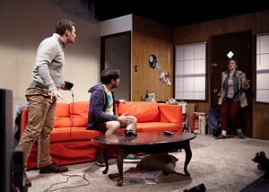 Be warned: before you get to the intriguing part, you will need to suspend your disbelief for a long time to get past what seems to be a nonsensical take on a thirty-something man in a state of perpetual adolescence and his obsession with dinosaurs. When we first meet Pete (Greg Carere), he is in his man-cave of a home (cheap furniture, X-box controllers on the coffee table, a case of beer on the floor, blinds drawn against the sunlight). He and his buddy Bo (Simon Winheld) are playing a football video game. Pete is not entirely focused, though. He is predictably distracted by the recent break-up with his girlfriend Julie (Rosie Sowa), but there is something more, something in the air that he can't quite put his finger on. And then, before you can say "the diplodocids are coming!" in bursts a frantic Julie, warning the guys that the town is being overrun by marauding dinosaurs (confirmed for us by Caitlin Cisek's low-budget but effective production design, Remy M. Leelike's lighting, and Megan Culley's music and sound design). Amidst the panicked confusion that takes up most of the first act, Pete suddenly turns on Bo and pushes him out the door to face a certain death. Act I ends as a dinosaur egg, conveniently lying in wait under the sofa, cracks open and out steps Nero, a young Tyrannosaurus rex (also played by Mr. Winheld.) After intermission (the play runs an hour and forty-five minutes), things start to make a kind of absurdist sense as the playwright begins to delve into Pete's mental turbulence. But the most creative element is Winheld's gloriously outlandish and absolutely committed performance as the upper crust British-speaking T-Rex. His over-the-top portrayal of Nero is funny, caustic, and threatening all at once, even as we gradually understand Nero's origin as a Jungian archetype, a "monster from the id," to borrow a term from the classic sci fi film Forbidden Planet. "First the clouds. Then the storm. Then the monsters come," is how Julie succinctly puts it as the real battle commences. Either Pete will be able to wrestle Nero back into a quiet corner of his psyche, or the metaphoric T-Rex will consume him. Pete Rex, a production of The Dreamscape Theatre and directed by Brad Raimondo, does need tightening and at least some hint in Act I that we are not merely watching a goofy fantasy about a repressed man-child. But the playwright is on to something here with his examination of a psychological crisis in which imagined monsters burst forth to take over the life of a troubled individual.