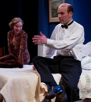 Director Laura Livingston has drawn fine performances from the Metropolitan cast. As the easily influenced Matthews, Kyle Minshew effectively shows the character's struggles to stay morally strong. Anna Marie Sell is terrific as Mary, Grant's upright wife, who is often treated by the politicos as the other woman. Jennifer Reddish suitably downplays Mrs. Thorndyke's cold and calculating qualities and shows hints of vulnerability. Michael Durkin plays James Conover (Adolphe Menjou in the film), and he effortlessly shifts from cuddly to ruthless, sometimes in a single scene. Jamahl Garrison-Lowe does not deliver the screwball-comedy barbs that one might expect from his Spike MacManus character (and as mastered by Van Johnson, the movie's Spike), but he has charm to spare. Special mention must also be given to Linda Kuriloff, who is hilarious as Lulubelle Alexander, the socially and politically uninhibited, Sazarac-swilling wife of a federal judge. Vincent Gunn's adroit sets, consisting mainly of rotating wall units, transform smoothly from a Washington, DC office space, to a Detroit hotel room and lobby, to a posh New York City apartment sitting room. Sidney Fortner's costumes have just the right 1940s stylish flair, and Christopher Weston's lighting ably establishes the mood and tone. As one expects of the Metropolitan's approach to plays, a lot is done with so very little. The original Broadway production boasted 16 performers and 26 stagehands. In the tiny Playhouse, there are a total of 12 actors, most of whom play more than one role, and they do double and triple duty as stagehands. Now, if the government could work as efficiently and cohesively as this small company, the state of the union would be in excellent shape indeed.