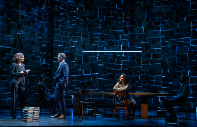 The confusion begins with Marion Williams' formidable but ambiguous set, a floor-to-ceiling backdrop of what look like yellowed manuscripts, framing a long table and stacks of books on the floor. OK, a literary theme, we get that. Here, bathed in Kenneth Posner's expressive lighting, we meet Sophie (Sarah Cooper), describing her courtship by and eventual marriage to Abe (Eddie Kaye-Thomas). He's a successful Jewish novelist, one who worships Philip Roth and probably writes a lot like him. There's a lot more to both of them, but we won't find that out for a while, because we're abruptly introduced to... Schmuli (Dave Klasko) and Esther (Lucy Freyer), Hasidim in 1970s Williamsburg, making nervous small talk on their wedding night: His opening volley is, "So how did you enjoy our wedding?" Schmuli is gentle and mild and seemingly attentive to his bride, but so devoted to his faith that he can't see her as a complete human being with choices and rights of her own, things that this severe branch of Hasidism prohibits. Esther has to secretly read novels and listen to FM radio and is afforded no role beyond wife and mother, an imprisonment of which she will grow increasingly resentful, leading to self-destructive decisions later in life. There are other aspects to this pair, too, but we won't discover them for some time, because we're back to... Abe and Sophie. At the mic at a bookstore reading, he sees movie star Julia Cheever (Katie Holmes) in the front row. Abe is obsessive and neurotic, paying insufficient attention to Sophie, whose parental duties are suffocating her own literary ambitions. But he's also a crafty verbal charmer and he knows it, so both he and Sophie know he's going to flirt wildly with Julia. Soon novelist and celebrity are ensconced in a voluminous correspondence, portrayed onstage as plain old dialogue. Are these texts? Tweets? Very short rapid-fire emails? Couldn't director Barry Edelstein have found a clearer way to convey that? And why these two particular couples? Are they linked? They are, but we don't find out how until about halfway through. Meanwhile, while Julia drifts blithely through the action, more of a device than a character, the marriages of both couples careen all over the place. Sophie and Abe are variously mutually supportive, affectionate, distant, and blisteringly combative, culminating in Abe having a breakdown, which Kaye-Thomas, to these eyes, rather overplays (and then the next scene illogically has the two making casual chitchat, even as their union is collapsing). Schmuli, taking his own love of music and nature for granted while relegating Esther to her narrow preordained existence, gradually loses our sympathy, though I don't think this is Ziegler's intent. So much is left out: What are the personalities of both couples' children? What does Schmuli do for a living? Why is Abe onstage while Schmuli and Esther are playing a scene, and why do Abe and Julia conduct an e-correspondence with his head on her knee? Why is this called The Wanderers? (An explanation does arrive for that, at the last minute.) Ziegler writes well-turned dialogue, and even affords a couple of good laughs. (Sophie: "I will never understand why you want to raise our kids in a religion you hate." Abe: "Because that's what Jews do!") The principals' inner lives, though, remain more obscured than they have any right to be, especially given the ample time they spend directly addressing us. All four experience moments of great unhappiness, the most convincing of which may be Esther's, thanks to Freyer's precisely calibrated reading of it. Cooper catches Sophie's many moods, but we're never sure exactly how we should feel about her. Ditto with Klasko's Schmuli, whose docility and uncertainty so clash with his Hasidic absolutism, he feels like two different people. Dividing the proceedings into chapter headings (Marriage, Children, Boredom, etc.) doesn't help explain Abe's and Sophie's and Schmuli's and Esther's motivations. And Ziegler withholds a bombshell about Julia until near the end, one that helps make sense of everything that preceded it, but also introduces some logical holes that don't entirely get sewn up. The Wanderers has some trenchant observations about the price of independence in a restrictive environment, the gnarly twists and turns in a modern marriage, and the consequences of a vivid fantasy life concocted by an active imagination, but I might have enjoyed it more if I didn't spend so much time going, "Huh?" And if Ziegler has a resonant statement to make about Judaism and assimilation, I didn't catch it. For that, go to Leopoldstadt. The Wanderers