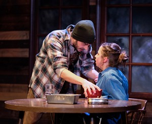 Brilliant Traces begins with a bangliterally. Runaway bride Rosanna DeLuce (Alyssa May Gold) is pounding on the cabin door belonging to Henry Harry (Blake Merriman), a social exile living somewhere in the Alaskan hinterland. Rosanna, still wearing her full bridal gown, veil, and satin slippers, barges in on Henry, who is enveloped in blankets and resembles a hibernating bear. She is a one-woman rampage, and in her opening monologue she is as blustery as the howling blizzard conditions outside. Overcome with exhaustion and the effects of quickly-downed whiskey, she finally passes out, and Henry calmly and gently undresses her and puts her to bed. When Rosanna wakes up (two days later), the two spar, commiserate, and finally reveal the extent of their pain that, as Rosanna explains, goes as deep as her DNA. For reasons that will not be divulged here, each is carrying the psychological scars of tragedy and sadness. The palpable, brilliant traces of these traumas have made them both flee as far as possible to avoid all future human intimacies. With dangerous whiteout conditions surrounding them and with no place to hide from each other in the one-room cabin (nicely designed by Matthew S. Crane and atmospherically lit by Paul T. Kennedy), the two will inevitably find solace, and perhaps salvation, in the comforting presence of another person. The play is most effective when it allows the characters to interact honestly and without literary pretenses. The setup is intriguing, and the ideas are worthy. Unfortunately, there are a few too many writerly excesses that undermine character development and narrative believability. For instance, there is a recurring reference to Rosanna's satin shoes that Henry burned in the broiler in an attempt to dry them. The mention of "cooking" her shoes, therefore, becomes a frequent (and increasingly unfunny) punchline, and then the shoes take on unwieldy and overly weighty symbolism. There are also moments in which the dialogue is a little too overwrought and overwritten. Lyrical allusions to out-of-body experiences, extraterrestrials, and heartbeats (which at one point is accompanied by a regrettable lighting effect) are at odds with the plain spoken characters. As the snowbound couple, Gold and Merriman do as well as they can with the material. In the original production directed by Terry Kinney the parts were performed by Joan Cusack and Kevin Anderson, who were quite memorable. I saw that production, and I remember that Cusack in particular was a force of nature. She beautifully captured the zaniness, sexiness, and heartbreak of the character. To get a sense of the way she simultaneously encapsulated the absurdity, anger, and sadness of the human condition in Brilliant Traces one need only look at the scene from the film In and Out in which her jilted character screams at the cosmos, "Is everybody gay?" Directed by Joshua Warr, Gold plays the character as much more grounded than her predecessor, and it works. She arms herself with steely toughness, but her vulnerability and self-proclaimed weakness emerge believably as she faces the overwhelming feelings of existential loneliness. In the far less showy role Merriman is a good foil for his uninvited houseguest. As the play progresses, he gradually sheds his aloofness, and we see the broken shell of a man underneath. His Henry is instinctually and preternaturally nurturing, and in his portrayal there are glimmers of hope even as the character tries to suppress them. Brilliant Traces reminds us that in our darkest times and in the remotest of places, human compassion and empathy can suddenly appear. In fact another unlovable loser might be right outside the door.