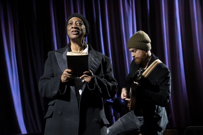 Unlike the 2011 National Theatre production that co-starred Benedict Cumberbatch and Jonny Lee Miller (who alternated the lead roles of Victor Frankenstein and The Creature) and boasted a large cast and lavish productions values, CSC's Frankenstein boasts only two performers and a bare bones staging. Stephanie Berry portrays both The Creature and Victor Frankenstein, and Rob Morrison, who provides musical accompaniment on guitar, mandolin and dulcimer, occasionally joins Berry playing supporting roles, including Victor Frankenstein. Berry and Morrison are talented; they are not the problem. It's the flat adaptation combined with a static staging that's the problem. Bizarrely, the show begins with Morrison coming onstage and tuning his instruments. The audience isn't sure if this is part of the show or exactly what's going on. (Couldn't this tuning have been done before the audience was seated?) Finally, Morrison sits downstage, left, on a chair and begins creating sound effects on his guitar. Berry gives us a short prologue as Dr. Frankenstein, which is followed by the birth of the creature and thirty to forty minutes of unspoken storytelling as the creature discovers who he is and his place in the world around him, before he begins his journey to Geneva to find his creator. None of this is theatrically compelling or emotionally involving and the story moves at a glacial pace. Additionally, despite the fact Douglas and Bernays have cast an African-American woman to play The Creature (a bold and laudable decision), there's no discernible comment or deeper meaning ascribed to her casting. The Creature refers to himself as a man in his request to Dr. Frankenstein that he make a mate for him who will love him as he goes through life, so are we to assume that Berry's presence is simply colorblind and gender-blind casting? If not, anything more profound isn't revealed to us.