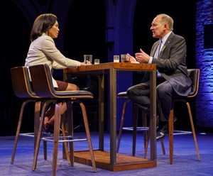 The play's central character is a newbie member of Congress, Rep. Sydney Millsap (Eisa Davis), "the first woman and the first person of color" to be elected from her Texas district. Everyone she comes into contact seems to want to point this out to her (as if she doesn't realize it herself). Particularly ingratiating are two lobbyists, Lauren (Aya Cash) and Kate (Gillian Jacobs), as well as Millsap's glad-handing Texas colleague on the Senate side, John McDowell (Zach Grenier). All three are well versed in the art of vapid political flattery, and all, of course, are seeking something from her. The lobbyists want her ear, while the senator wants her to vote with her party in opposition to a bill that would hurt its contributors by closing a modest tax loophole. It is all part of the normal day-to-day routine of mutual backscratching that is a given and an expectation. But Millsap is having none of it. She won't meet with any of the lobbyists' clients, and she won't tow the party line with respect to a bill that she supports. Indeed, she is determined to take advantage of her populist, outsider status to fight big money's incursion into politics. In office for less than a year, she already is frustrated by the inordinate amount of time she is compelled to spend attending fundraisers, eating endless meals of salmon canapés, and placing scripted cold calls to potential contributors. The Congresswoman finds it humiliating and a terrible waste of her time, and she is determined to be a voice for change. "I'll hold my seat," she tells a disbelieving Kate during one of their fruitless conversations, "because a whole lot of people want change. They want it so badly, they're willing to vote for psychopaths." The playwright is clearly drawing on today's political climate in shaping such speeches, but Eisa Davis delivers this and similar lines with such inspiring conviction, you might want to move to Texas just so you can vote for her. Director Thomas Kail brings out strong performances from his cast, especially from Ms. Davis and Mr. Grenier as the Texas politicians. Ms. Davis, in particular, is quite convincing as the political newcomer, swept into office as part of the tide of anti-establishment sentiment and sympathy for her as a Gold Star widow. It's easy to see her nothing-to-lose stance as she speaks out against the polluting impact of money on our political system, and to feel her dismay when she realizes the other side will stop at nothing in its pursuit of power. For his part, Grenier's Senator McDowell comes off as a decent sort who has played the Inside-the-Beltway game for so long, he has forgotten whatever values that led him to seek public office in the first place. Less well defined are Kate and Lauren, the two young and ambitious lobbyists. The come in and out of the play rather frequently, but they are mostly used as sounding boards for the other two, or to help explain to the audience how everyone has learned to game the system. Really, though, how much do we have to know about "carried interest" in order to understand Millsap's position? It is also pretty clear that Lauren and Kate have had a personal romantic history together, but this is not explored, nor does it seem relevant to the plot. The physical production also seems to have not been well thought through and is a little strange at times. Many of the scenes take place in bars or restaurants, with the tables and seating on turntables that keep the actors in motion while they drink, eat, and talk. Why this is the case is not at all clear. Nevertheless, both the playwright and the cast make the most of our fascination with the mechanism of U. S. politics so that, despite the flaws, there is plenty to keep both idealists and cynics in the audience entertained for the play's 100 intermissionless minutes.