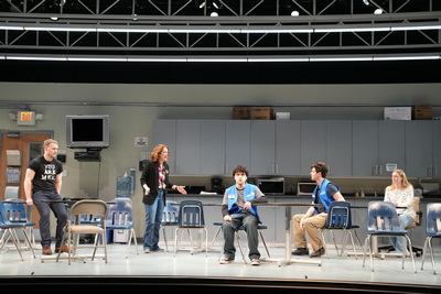 A Bright New Boise premiered Off-Off-Broadway in 2010, and it is among Hunter's earliest works. Audiences acquainted with his plays will recognize familiar elements and motifs, such as a profound yearning for human connection, life's precariousness, and dark humor drawn from philosophical absurdism. Idaho is not just a geographical location in the Midwest, it is a state of mind in Hunter's conception, and pain, sadness and laughter are applied in equal measure. The play's central character is Will (Peter Mark Kendall), who has recently moved to Boise from a small town in northern Idaho. Will was involved in a shocking religious scandal and he is starting a new life as a minimum-wage employee in a Hobby Lobby store. The craft store's highly strung and foul-mouthed manager Pauline (Eva Kaminsky) notices some irregularities in Will's resume, but she hires him anyway after he promises to not attempt to unionize the employees. Within the first few minutes, though, it becomes clear that Will has ulterior motives for applying to this particular Hobby Lobby (and which I will not reveal here). These motives do not involve unionization. Set mostly in the store's break room (adeptly designed with colorless sterility and functionality by Wilson Chin and lit with cold fluorescents and razor-sharp neon designed by Jen Schriever), we soon meet some of Will's new co-workers. Alex (Ignacio Diaz-Silverio) is a high-school student and prone to panic attacks. He has a terrible home life with his adoptive parents, but he finds solace in music by artists like Brazilian composer Heitor Villa-Lobos. Leroy (Angus O'Brien) is Alex's older brother and deliberately provokes his manager and the customers by wearing shirts with messages like, "You Will Eat Your Children," which is about the only one that can be printed here. (April M. Hickman designed the witty costumes.) As an MFA student in visual arts, Leroy claims he's "the only one in this store who knows anything about art supplies," and "the only one that can answer actual questions." His job is secure. The fifth character is Anna (Anna Baryshnikov), who, like Will, hides in the store after closing to spend several hours each night in the break room. Anna has an unhappy homelife, and the solitude allows her a space to read. Books with tragic endings are her favorite. Director Oliver Butler and the excellent cast draw out and subtly reveal the characters' debilitating sense of isolation even as they clumsily struggle to relate with one another. Additionally, the production unsettles through its references to dark forces that seem to pervade the Hobby Lobby sanctum (and the specific chain store with its religion-based intolerance was surely a deliberate choice). The television, for instance, periodically shifts from a pair of anodyne corporate talking heads to graphic medical procedures on ears, eyes, and indecipherable organs. (Stefania Bulbarella provides the projection and video design, and Christopher Darbassie designed the evocative sound.) One of the intellectual pleasures of experiencing artists' early work–and this isn't intended as an underhanded slight–is appreciating the noticeable growth and development of their craft. In Hunter's recent plays, the existential mysteriousness and character eccentricities are much more organic. Here, some of the plot points feel manipulated, and we detect the playwright at work rather than in the service of the characters. A Bright New Boise may not be his finest work, but visiting Hunter's Idaho always has its fair share of pleasures and revelations to make the trip worthwhile. A Bright New Boise