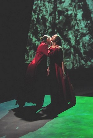 Considered on a strictly literal level, Dickstein doesn't prove her thesis. Her collision of two versions of the woman, the one who was then (Laura Butler) and the one who is today (Erica Berg), asks the question but skates around the answer, eventually leading the play down a road not unlike most other modern adaptations of the story. (One of these, Too Much Memory, was seen at last year's Fringe Festival and subsequently Off-Broadway.) But if the story's specifics don't entirely satisfy, its visual interpretation almost completely does. Sophocles's chorus of Theban elders has been reenvisioned as the doomed girl's peers, a group from which her sister Ismene (Kimiye Corwin), her boyfriend Haemon (Jorge Rubio), and the others in her life - except for Creon (John Campion) - will eventually emerge. They move as she does, or as she should: in tight, coordinated motions. Now they leap, now they skip, now they're bounding in a circle or forming a complicated undulating circle that could have spun right out of a Las Vegas revue. They're even clad in yards of clinging and billowy red (by costume designer Oana Botez-Ban), just as the Antigones are. Their movement (which has been heavily derived from Balinese styles and coordinated by Patty Gallagher) brands them as a community, and Antigone as both participant and outsider. Watching her step away from her countrymen, you understand immediately what she's sacrificing, and what the dangers are: It's easy to disappear in a throng, and if you can't identify the forms moving about the dim periphery of Tyler Micoleau's lighting you'll never know whether you're ignoring or scorning your family, your lover, or your ruler. But as Antigone's resolve solidifies, and as the group's motions grow stranger and more foreign - what was once expressions of animal joy are now the figurative bars of the heroine's holding cell - the terror of groupthink and the even more frightening rejection of it come into startling focus. The rhythm of Antigone's existence is morphing, distilling, dissolving, unstoppable until it's subsumed not just her, but Haemon, Creon, and even the queen Eurydice (Paula McGonagle). Even if everyone else is waltzing without you, you never truly dance alone. Fire Throws begins and ends in that cave, behind the boulder that officially separates the world from the imprisoned Antigone, as well as in the woman's tortured mind in its final moments of life. But it's primarily concerned with individual and collective freedom and how that's interpreted by those both in the know and outside of it. Dickstein's script is not especially creative in addressing this, but her direction of it - with the Antigones overlapping each other's dialogue at strategic moments, and with some astonishing stage pictures that splash your eyes with the very essence of the chaos into which Thebes is sinking - is startlingly adept at making two millennia worth of history up-to-the-moment trenchant. Maya Ciarrocchi's video and projections - which feature a boomingly ghostly Teiresias (Juliana Francis-Kelly) and a number of filmic special effects - threaten to diminish the performers who for the most part blaze with life. The exception is Campion's Creon, who's so hysterically affected he seems more removed from the human race than he does from the impact of his self-serving laws. But the others are marvelously intense, with everyone demonstrating how their own characters are, in a sense, no less trapped within their societal roles than is Antigone within that cave. Neither the young and spirited Butler nor the more mature and clearer-eyed Berg conveys confinement, however. That's how it should be. Both women, tapping into Antigone's conscience and will to define either her era or our own, are bracingly unapologetic, accepting their roles as inevitabilities but never restricting them from becoming more. This, it ultimately becomes evident, is how Dickstein believes timeless icons are made: from actions that magnify one's own concerns to a country- or globe-spanning scale. That makes Fire Throws, like Antigone before it, a fitting tale for our time or for any other.