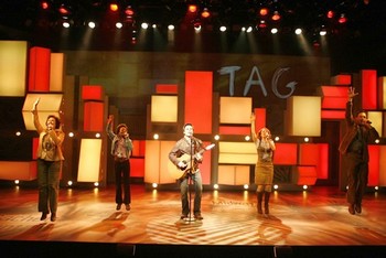 The theatre company The Civilians traveled to Colorado Springs in late 2006 to interview its inhabitants about the growing "mega-church" movement centered there. During their 10-week investigation, Ted Haggard, the pastor-in-chief of the enormous Colorado Springs-based New Life Church, was publicly accused of homosexuality (practiced with a prostitute, no less!) and methamphetamine use, and forced to resign amid a typhoon of acidic national publicity. The Civilians couldn't have planned it better. They could, however, have done just about everything else better once they got back to New York. The company's quirkily incisive takes on topics such as America's misinformation super-byways in I>(I Am) Nobody's Lunch and the human lost-and-found in Gone Missing demonstrated its unique knack for dramatizing and musicalizing the everyday things we all ponder, but rarely bother to say. But Christian Evangelism and its impact on the hearts, minds, and souls of Americans of any (or no) faith is so specific and so polarizing that it practically demands something firmer and more declarative. Steven Cosson, who directed the show and wrote it with Jim Lewis (book) and Michael Friedman (songs), has fashioned the company's interviews and its frontline perspective on history-in-the-making into the remotest, most condescendingly partisan, and least involving Civilians piece yet. Although The Civilians don't directly attack evangelicals, they hardly present them in a positive light. Most of the time they don't even try. Haggard is depicted as a harrowingly one-dimensional hypocrite, disconnected from his congregation and, by unspoken extension, the word of God he's charged himself with spreading. While a few noncommittally nice words about him do occasionally slip through, New Life's major spokespeople are enacted as vapid, humorless, and passive-aggressive drones. The chief proponents of its youth ministry, Tag, are terminally unhip hippy wannabes bursting and hopping about with plastic, surface-level spirit, yet none displays any identifiable devotion or love.