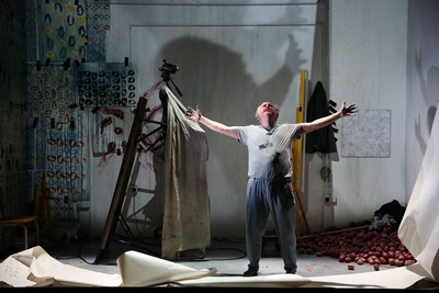 Written in 1992 upon the death of his former partner, Mary Farl Powers (an acclaimed printmaker who died of breast cancer when she was only 43 years old), Muldoon's wide-ranging poem explores his grief and their relationship. The problem is that American audience members may be unfamiliar with Muldoon's lexicon and writing style, so it may be wise to read the poem in advance and look up any unknown words and references. Otherwise, much of the poem may be lost on such viewers. What won't be lost is the emotionally gripping performance by Townsend, a commanding actor with a riveting presence. He and Yates have transformed the poem into a multi-sensory experience, with cryptic music by Teho Teardo, an eclectic set and costuming by Rosanna Vize, evocative lighting by Paul Keogan, edgy video design by Jack Phelan, and haunting sound design by Sinéad Diskin. Incantata is a passionate exploration of the complexities of a relationship between two artists. It is a vivid onstage testament to their art, lives, love and loss. And who can't relate to that?