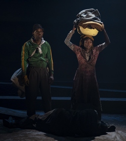 Boesman (Sahr Ngaujah) and Lena (Zainab Jah), who are described in the play as a "Coloured" man and woman, are homeless and perpetually wandering through South Africa during apartheid. They are reviled in their own country and treated as refuse by the white oppressors who persistently and viciously raze temporary and makeshift housing colonies. As Boesman explains, "We're whiteman's rubbish. That's why he's so fed-up with us. He can't get rid of his rubbish. He throws it away, we pick it up. Wear it. Sleep in it. Eat it. We're made of it now. His rubbish is people." On another level, the play shows the brutal effects of racism both on and within the Coloured and Black communities. Fugard deftly reveals how oppression breeds oppression. Boesman treats Lena cruelly, mocking her in front of Whites and hitting her as he acts on his own boiling rage. She in turn lashes out at her husband. Rather than finding comfort in their shared misery, they are in a near-constant bout of verbal and physical assaults on each other. A wandering Old African (Thomas Silcott), who is described as Black and therefore of a lower caste than Boesman and Lena, joins the couple, and Lena instinctively tries to comfort and befriend the man. He speaks only Afrikaans, so the barriers between them are made even more impenetrable. Her husband, on the other hand, is spiteful and violent toward the man, referring to him as excrement and worse.