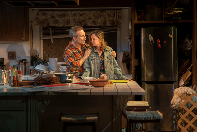 When the lights rise on the Tate family's homey and cluttered kitchen, it appears the Oklahoma house has been struck by a tornado. The windows and sliding glass doors are gaping holes, and shards of glass litter the linoleum floor. A dreamcatcher, tauntingly ironic, hangs near the carnage. Arnulfo Maldonado's set design masterfully captures the play's stark realism and surreal undertones, reflecting the fractured world of Shepard's dystopian vision. (Jeff Croiter's lighting, Catherine Zuber's costumes, and Leah Gelpe's sound enhance the sense of a world out-of-whack.) The Tate family is plagued by a desperate yearning to escape their emotional and financial ruin. Ella (Calista Flockhart), the mother, plots to sell their decaying home and flee to Europe and start over. As she tells her troubled son Wesley (Cooper Hoffman), "They have everything in Europe. High art. Paintings. Castles. Buildings. Fancy food. They have history in Europe. They know where they came from." Wesley, however, clings to a romanticized vision of America, convinced that restoring their (literally) broken home will somehow redeem them. Little do they know, Weston (Christian Slater), the family's alcoholic patriarch and who is responsible for the wreckage, has already secretly sold the home to escape crushing debt–debt he equates with being his right both as an American and a man. For Weston, the system is designed to emasculate. In a disturbing and darkly comic monologue, Weston metaphorically describes the process, recounting the tale of an eagle seizing the testicles of castrated sheep, its talons grasping "those fresh little remnants of manlihood." Fiery and headstrong Emma (Stella Marcus), the youngest member of the Tate clan, is also hellbent on escape. She dreams of becoming an auto mechanic in Mexico where her indispensability would turn into lucrative profits. She says, "I like the idea of people breaking down and I'm the only one who can help them get on the road again." But she would "charge them double for labor, see them on their way, and then resell their engine for a small mint." The two other prominent figures in the Tate household include a maggot-ridden sheep (provided by Vidbel Animal Actors) and an unyielding refrigerator. Few household items better represent materialism, consumption, and financial standing than the refrigerator, so the eminent appliance naturally becomes a central image. Director Scott Elliott is no stranger to Sam Shepard. In 2016 he helmed a production of Buried Child starring Ed Harris and Amy Madigan. To its credit, Elliott's production makes the individual family members recognizable, and the performers soften their hardness, particularly in the first act when they are deliberately brutal to one another. As a result, the Tates, burdened by the curses of their social class and their futile struggle for upward mobility, are sympathetic. However, this comes at the cost of the play's morbid, twisted pleasure. The outrageousness and shocks feel muted, and the psychological horrors dampened. Additionally, the absurd moments, including the periodic breaking of the fourth wall, feel labored and self-conscious. Still, there are some good performances. Despite lacking a sense of genuine menace, Flockhart and Slater are well paired. Their sniping in the first act seems lived-in and the result of years and years of slights and betrayals. In the final act, they disclose moments of compassion, glimpses of the marriage before fate relegated them to the starving class. If Cooper seems a bit too boyish as Wesley and if Marcus is not completely convincing as an adolescent girl, they effectively show the cyclical nature of poverty and casual barbarity it produces. Kyle Beltran and Jeb Kreager do well in the antagonistic roles of Taylor (the insidious lawyer/speculator) and Ellis (the treacherous bar owner), providing perfect foils for the doomed Tate family. Shepard's influence echoes in the work of contemporary playwrights such as Martin McDonagh, Tracy Letts, and Branden Jacobs-Jenkins. With his characteristic blend of realism and dark humor, Shepard established a visceral dramatic language that continues to resonate. Curse of the Starving Class, even in a production that regrettably does not go for the jugular, remains distressingly relevant today. Curse of the Starving Class Through April 6, 2025 The New Group Romulus Linney Courtyard Theatre at The Pershing Square Signature Center, 480 West 42nd Street between 9th and 10th Avenues Tickets online and current performance schedule: TheNewGroup.org