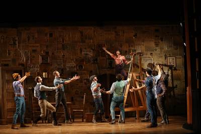 In general, the sixteen-member company perform Willson's songs effectively, especially the two standards from the original version, "I Ain't Down Yet" and "Belly Up to the Bar, Boys." The latter number calls for thrilling choreography, and while Marshall's choreography evokes comparisons to Michael Kidd's dances for Seven Brides for Seven Brothers, it does not pack nearly the thrill. A can-can number in the second act fares only marginally better. Among some of the welcome musical additions to the score (Joey Chancey is the music director and Larry Hochman did the notable orchestrations) are the lovely "He's My Friend" from the film and a rousing "Share the Luck," which was written for the Red Cross (and bolstered with new choruses by Scanlan). Much of the score, alas, is merely serviceable. The production's design does not help in brightening the proceedings. The back wall is plastered with yellowing newspapers and period framed photos. Instead of establishing the frontier setting, Brett J. Banakis's scenic design gives the impression of a fusty old basement. With the aid of Peter Kaczorowski's golden lighting, the second act, which mostly takes place in Denver, offers the playing space a little more air and openness. This is achieved by raising the top half of the backdrop to create a mountain skyline. (Maria Björnson achieved a similar effect in the original production of Aspects of Love.) Sky Switser's costumes (particularly in the women's period frocks) provide necessary and appreciated dashes of color. Willson's The Unsinkable Molly Brown has never been considered a musical gem of Broadway's golden age, and it pales in comparison with the composer/lyricist's near-perfect The Music Man. Sadly, the 2020 version, which should be called Willson and Scanlan's The Unsinkable Molly Brown, no matter how fervently it persists, does not raise the show in artistic merit.