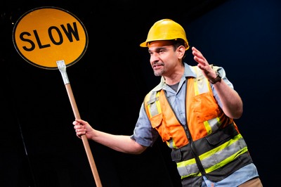 As we come to know the character, identified only as "Man" in the program, we soon understand why he has left a career as a physics professor and taken on a position at a construction site, holding up a sign with the word "Stop" on one side and "Slow" on the other. There is little that the job requires of him other than to keep traffic moving along, which gives him plenty of time to reflect on the downward spiral of his life. "After all," he says, as if pointing out the obvious, "I am wearing reflective gear." And reflect he does, not only on the events that led to his current state, but also on his former, now abandoned view of the universe as predictable and controllable through an understanding both of science (Einstein is his idol) and from the collective wisdom of philosophers and poets, including Robert Frost, Alexander Pope and, especially, Shakespeare, whom he quotes at several points during the show. The result, at least in the first hour, is a kind of interplay between realism and magical thinking, humor and heartbreak. There is even a logical ending place that very well could mark the finish of the play. But doesn't. Abruptly, the tone and style and content shift into a 30-minute coda in the form of a rambling stream of consciousness catch-all that, perhaps, is meant to indicate a complete psychological/emotional breakdown of the character but which is all but incomprehensible within the context of what has come before. We have entered into another realm altogether, a headlong dive into what seems to be a gloss on the ancient Greek notions of love (agape, philios, eros), along with a side trip into a darkly puzzling combination of Jonathan Edwards's eighteenth century sermon "Sinners in the Hands of an Angry God" and a trip into Dante's "Inferno." Man's life is hell??? If that's the point, it's quite a metaphor, and a difficult and confusing one to sit through. A Sign of the Times is, as you might imagine, a lot to take in. It is an unabashedly brazen effort by a playwright (who also directs) with a lot of ideas to explore but who hasn't been able to figure out how to convey these to an audience who, generally, are not enrolled in an undergraduate humanities course. If they were, the reading list might include (in addition to the aforementioned), Shaw's Don Juan in Hell, Nick Payne's Constellations, Simon Stephens's Sea Wall, and something from Samuel Beckett, perhaps his novel "The Unnamable" that famously ends with the appropriately existential lines: "You must go on. I can't go on. You must go on. I'll go on." For what it's worth, the production is nicely supported by Caitlin Smith Rapoport's lighting design, David Van Tieghem's sound design and underscoring, and Kristen Ferguson's sometimes realistic, sometimes hallucinatory projections. And there, throughout it all, is Javier Muñoz, bravely handling logic and illogic with great aplomb through to the final blackout.