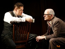And believe it or not, it starts with a showstopping joke: "My name's Bill W., and I'm an alcoholic." What? Your sides aren't exactly splitting? Maybe you had to be there. As uttered by Robert Krakovski, playing one-time stockbroker and AA co-founder Bill Wilson, that line elicited enough laughter and applause at the performance I attended to momentarily make me wonder whether I'd wandered into the wrong venue. Standing with his feet askance, wearing a slyly toothy smile, and showing a glint of controlling knowingness in his eyes, Krakovski certainly looked more like a stand-up comedian than a man beginning a heartfelt confession. But how much can you tell in a play's first five seconds? Maybe it was just this particular audience? Surely the show would get back on track and prove this reaction was an unintended aberration? Nope. As directed by Rick Lombardo, producing artistic director of the Waterton, Massachusetts, New Repertory Theatre, where this production got its start, Bill W. and Dr. Bob is a neo-vaudevillian freak show that demonstrates why vaudeville keeled over in the first place. What should be the serious story of Bill and Dr. Bob Smith (Patrick Husted) hitting rock bottom, finding each other by chance, and developing the foundations of AA simply to survive is treated so hammily that Friday performances should probably be canceled during Lent. While there's nothing wrong with threading humor through a topic of this severity, Lombardo and his actors spend most of the evening bordering dangerously on the uncouth and outright distasteful, treating potentially shattering depictions of drunkenness into recreations of I Love Lucy's Vitameatavegamin episode. As the play begins in 1925, with Bill and his wife Lois (Rachel Harker) facing the final days of Bill's pre-Crash benders, it's entirely possible Lombardo believed an enforcement of pastry-puffy mid-1920s acting styles would most effectively leaven the midnight-dark mood. And with a pianist (Ray Kennedy) positioned permanently upstage, and a couple of scene changes covered by songs sung by members of the company, it really does seem old-fashioned entertainment is what Lombardo had in mind. But most of what's intended to be funny isn't - this material doesn't lend itself naturally to the broad comedy Lombardo has encouraged, at least with these performers. Only Harker finds some sympathy in her token conflicted wife, but her overly hairsprayed stiffness makes even that hard to assimilate. As the other neglected spouse, Anne Smith, Kathleen Doyle is all judgmental, patrician stuffiness, more appropriate for a monsterly Oscar Wilde matron. The gentle, genial Krakovski is only miscast as the violent, self-absorbed Bill; but Husted is flat-out embarrassing, especially when playing inebriated much the way Alan Alda might play George M. Cohan in a remake of Yankee Doodle Dandy. Marc Carver and Deanna Dunmyer play an endless series of ensemble roles with an endless series of funny voices that are not endlessly funny. To Bergman and Surrey's credit, their own work is relatively restrained, making decent (if not wholly successful) attempts to flesh out characters who could be little more than stumbling symbols of the dangers of excess. Sure, there are some howlers ("We need to find ourselves a steady supply of more reliable alcoholics") and one too many improbabilities (do we need to see the wives' first, unofficial Al-Anon meeting?), but the script doesn't lack for honesty, sensitivity, and a sincere desire to improve others' lives. None of that, however, has survived the trip to the stage, and the evening resulting from the intervention of Lombardo and his cast suggests that a production this laughable is worse than none at all. The best that can be said of Bill W. and Dr. Bob is that it generally stops just short of insulting the real people suffering from the real problems it's trying to illuminate. Any theatreholics in the audience, however, don't get off quite so easily.