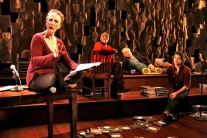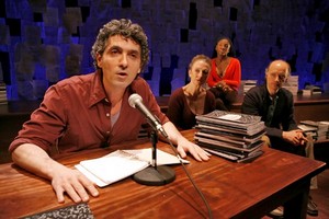 Sooner or later, however, every role is recast, and the beloved monologist who so typified the warmly cynical Northeast mindset is no exception. Spalding Gray: Stories Left to Tell, now playing at the Minetta Lane Theatre, fleshes out this complex personality with five actors rather than just one, and by requiring them to read Gray rather than "become" him. A few bursts of static aside, one imagines Gray would be pleased with the results; given the care, detail, and just plain love in the show, it's hard not to be. As conceived by Gray's widow, Kathleen Russo, and directed by Lucy Sexton, those five actors - Kathleen Chalfant, Hazelle Goodman, Ain Gordon, Frank Wood, and a ringer to be named later - adopt different facets of Gray's public and private personas to weave a biography as textured in voice as was the man himself. Whether the stories they spin are recited, intoned, rattled off, or acted out as elaborate one-person performance pieces (Goodman is the queen of that trick), they're all vivid building blocks of a life in words worth remembering. Yet as those blocks have been stacked here, even minor ruminations feel inordinately significant. Chalfant brings a stately friskiness to Gray's tales of Love, while Goodman is all caffeinated bump-and-grind as his Adventure, and Frank Wood creates a serene aura of down-home simplicity with each reading of stories about Gray's Family; another aspect, Career, is essayed by a rotating star (I saw Fisher Stevens, but Estelle Parsons is up next). Taken together, these elements almost feel like a single, complete internal person, with only the outer container missing. That's where Gordon comes in. Spending most of the show seated behind an unassuming wooden table, which holds little more than a microphone and a glass of water, Gordon tackles Gray's Journals and other private writings with much the same supple sonority the original brought to his own celebrated monologue work. Though in look and manner Gordon more resembles another theatrical soloist, Eric Bogosian, he's thoroughly successful in evoking the physical and vocal spirit of Gray, which is otherwise often sacrificed in favor of his writings' greater universality. If there's a single overriding problem with Spalding Gray: Stories Left to Tell, that's it: the presentation and performances don't grant any particular new insights. Wood brings an attractive, unadorned honesty to his speeches; Chalfant has an ample supply of sly spice to season Gray's libidinous side; Goodman's got untethered, slithering energy to beat the band; and Stevens brings an unusually well-fitting air of show-biz razzle-dazzle to the show's more glittery moments. But it's all ornamentation, a way around the fact that Gray's harshly autobiographical works, like Sex and Death to Age 14 and Swimming to Cambodia, are now forever separated from their originator.