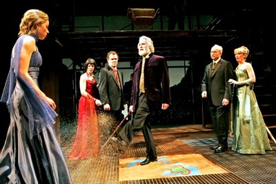 For this Lear, to borrow from another famous Shakespearean figure, all the world's a stage. But if Lear is an actor in his own personal melodrama instead of someone who mistakes theatre for life, there are no walls to come crashing down around him when his illusions are toppled. That's the case here, making it impossible for Kline's Lear to descend into madness - he's there from the very beginning, pinpointing in voice and manner the myriad methods by which a miscast actor can approximate a thousand feelings without one convincing. Kline's performance is heavily external: His posture changes from upright and strong, the measure of a monarch ready to pass on the crown, to so weak he can barely crawl, let alone sit up. But aside from that and Kline's outfit and ever-expanding white shock of hair, which eventually leave him looking like a cross between Kris Kringle and Lauren Bacall's Medea, there are few discernible differences between the opening's hopeful king and the finale's broken peasant prisoner. To the very end, both Lear and Kline look and especially sound like they're putting on a wrist-rapping morality play for a world adrift in recklessness. That might be fine, if it had anything at all to do with Lapine's down-and-dirty bullet-train conception. But with a Lear who's more of a subway performance artist than a man who must learn every truth the hard way, one can't accept anything at face value, an irredeemable detriment in a cautionary play about exactly that. Far more effective are the droll Bryggman, whose familiar put-upon everyman is a natural fit for the easily betrayable Gloucester; Cerveris's passionately doting Kent; and Michael Rudko as an unusually approachable Duke of Albany, whose marriage to Goneril can't quite stand in the way of his doing the right thing. Pierce and Odeh are somewhat one-note as Goneril and Regan, but come closer to justifying (in their own twisted ways) the girls' actions than most actresses do; Bush cuts an impressive figure as Cordelia, as militaristic as she is feminine, but lacks most of the heart that should Cordelia's most prominent feature. It's not surprising she comes across as chilly. Lapine has left little room for warmth in this production too packed with scenes pushing the story rather than fueling the feelings that will give that story a life of its own. As Albany states early on, "Striving to better, oft we mar what's well." Much the same is true of both Lapine and Kline in this King Lear.