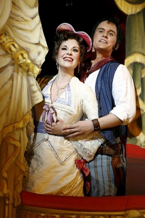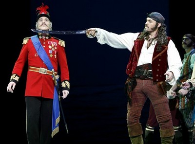 It's not recommended, however, that you pay too close attention to Pirates' plot if you wish to carry your sanity with you into old age; you're better off letting the shenanigans come as they may, and enjoying the singers and orchestra for putting up with it all. That's especially easy here, as Gerald Steichen keeps the score firmly in check, rendering a mature reading of the score that has nonetheless been stripped of all stodginess that can't be used to comic effect (leaving a few bars near the beginning of the opening shanty "Pour, Oh Pour the Pirate Sherry" and little else). Kudisch's blasting voice on numbers like "I Am a Pirate King," Jacoby's Gatling-rattling of an otherwise muted "I Am the Very Model of a Modern Major-General," McMahon's sumptuously self-indulgent "Poor Wandering One," and Myrna Paris's as Frederic's outlandishly operatic guardian Ruth round out this production's garden of earthy musical delights. Not everyone reaches quite the same level: Morgan's Frederic would be better served closer to medium-rare than charred-to-a-crisp, and Kevin Burdette pushes too hard to too little comedic effect as the Sergeant in charge of a catastrophically cowardly police force. His problem is not a unique one - it's a common ailment in anything this madcap to want to do too much. But Burdette and Groag might find some helpful advice in the Sergeant, who knows it's best - when faced with a pack of pirates - to just get out of the way and let them do their thing. And what a wild wallop of a thing that is - here, and always.