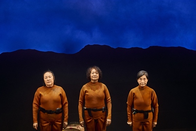 Boasting the same cast and production team as at A.R.T., the moving first play is about three geriatric haenyeoswomen who make their meager living ocean-diving to harvest shellfishwho are miserable, lonely, and waiting to die. Imagine a grim Korean "Golden Girls" with only three women and a lot of f-bombs. The self-referential second play is about a young Korean-Canadian playwright chaffing to live, but who's torn about the authenticity of her work as she struggles to finish a new play about three geriatric haenyeos. Imagine a self-indulgent fringe festival entry that thinks fourth-wall-breaking meta devices are clever. How much you'll enjoy Endlings will depend on your ability to enjoy the compelling charms of the first play without being overwhelmed by the self-indulgence of the second. If you're wondering what an endling is, the production, cleverly and economically directed by Sammi Cannold, tells you even before you sit down. Projected on a scrim is the definition of an endling: an individual living thing that is the last survivor of its species. We soon meet three such endlings in the form of the 70-ish Sook Ja (Jo Yang), the 80-ish Go Min (Emily Kuroda) and the 90-ish Han Sol (Wai Ching Ho), three South Korean women on a destitute island who don diving suits every day to go deep into the ocean in search of a living. Their dedication to the traditional ways of their ancestors is unquestioned, but whether their lives are fulfilling is seriously in doubt. Sook Ja's husband died when they were young and she never had children. Go Min's husband beat her and she, in turn, beat her children, who never visit. Han Sol's grandchildren call, but she tells them she doesn't think of them in an effort to keep them away so they don't make the same mistakes she did. All of them are waiting to die, but they soldier on each day unable to stop diving and complaining bitterly to each other about wasted existences and lives not lived. Thanks to the superb actresses inhabiting the haenyeos, their love for each other is palpable and painfully heartfelt, especially when tragedy strikes.
