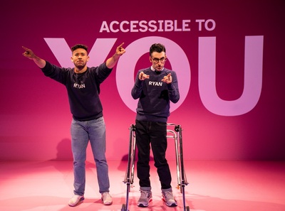 The integrated access is fabulous. As well as meeting the needs of disabled audience members, it provides a multifaceted theatrical performance with each form of communication supplementing and complementing the others. In this world premiere production, Dark Disabled Stories centers around the stories of Ryan, described in the script as "Late twenties. Gay man with cerebral palsy." Ryan is played by disabled actor Ryan J. Haddad and by Deaf actor Dickie Hearts, who points out a couple of times that he is an actor, not an interpreter–and a damn good one, as it happens. While Haddad leans toward stand-up-type acting, Hearts provides a full performance–subtle, warm, funny and charming, particularly during the section of the play that features his story rather than Ryan's. The third performer, Alejandra Ospina, plays "The Describer: A dry, feisty woman in a motorized wheelchair or scooter." She also tells an infuriating tale of trying to get around in the New York City subway system, where elevators are frequently broken and up-to-date information can be impossible to come by. You can feel her frustration and anger as she talks about not being able to fulfill obligations and responsibilities to other people because she cannot get where she wants to go. Early on, Ryan tells us, "Now, if you're gonna look at me as sad or pitiable... If you came here to pity me, you can leave." There is nothing pitiable about Ryan, and it's easy to feel his pride and his hatred of being condescended to. But, in a show that touts its 360-degree accessibility, is asking audience members to leave not a weird non-accessible choice? Do Haddad and company only want to be preaching to the choir? Much of Dark Disabled Stories focuses on Ryan's and Dickie's adventures hooking up with men, often strangers. These stories are mostly very funny, particularly with Haddad's wry writing and acting. However, while the ways in which those men are inconsiderate idiots are particular to Ryan's and Dickie's situations (e.g., leaving Ryan across a crowded bar from his walker, refusing to learn the sign language alphabet to communicate with Dickie), in general the stories are familiar tales of pick-ups being dicks. At one point, Dickie finds himself in Utah, where he allows himself to end up handcuffed by a stranger who has made him feel uneasy and unsafe and who has avoided establishing a safe word. He tells the story slowly and dramatically, with growing tension. Then, as he realizes that the stranger has total power over him, he says to the audience, "And you know what? [really, long pause] It's fun. And it's fucking hot." Since Dark Disabled Stories is so embracing of people's needs, where does this story fit in? For those in the audience who have experienced physical and sexual violence, it is a difficult, creepy, painful story to sit through, and the punchline does not mitigate that. Do our needs matter less? (And, no, I'm not kink-shaming. Once the stranger refuses a safe word, this story moves out of the realm of kink.) The rest of the show is frequently fascinating and often funny, though the topics often aren't. Day after day, the performers must navigate a world conspicuously indifferent to their needs, not to mention dealing with people who can be breathtakingly inconsiderate and thoughtless, even when they mean well. The most interesting stories to me are those in which Ryan has to explain that he needs less help or a particular sort of treatment, as in this speech to a TSA agent: If you let me go through the body scanner it will make the pat-down go a lot faster. I know I'm in this wheelchair, it's an airport wheelchair, I'm using it for distance and speed. But I'm holding this walker in my hands. I can walk. Yes, I can walk. Please listen to me. Please. I know what I'm doing. I know how to live in this body. I know what is safe for me and what isn't. I know you think you know, but you don't know. You don't know." Most of Dark Disabled Stories ultimately centers on people not listening and not recognizing each other's humanity. The show depicts this vividly in a worthwhile 75 minutes in the theatre.