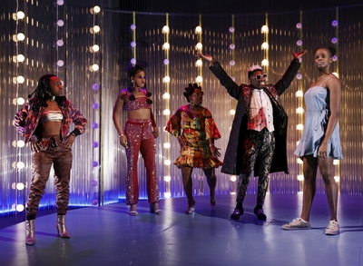 Pretty hurts for Akim (Nike Uche Kadre), the tall, stately, seemingly blessed young lady of the not-very-well-defined town of Affreakah-Amirrorikah. No such place exists on the map, but presumably we're in Nigeria. The town seems relatively prosperous, and the bright young teens we spend so much time with have a ready command of pop culture references, so let's roll with that. But a little more sociological context would be welcome. Akim is the loveliest of the bunch, at least according to the Eurocentric standards of beauty Sampson is railing against, and she finds her gorgeousness a burden. How much easier, she soliloquizes, not to be beautiful; "it is such a simple life that ugly people are granted." That doesn't sit well with quiet Adama (Mirirai Sithole), hanger-on Kaya (Phumzile Sitole), or, most vocally, jealous Massassi (Antoinette Crowe-Legacy). They're all about to turn 18 and celebrate at a big dance, which Akim won't be attending. In fact, her perpetually worrying mother (Maechi Aharanwa) and strict dad (Jason Bowen) barely let her leave the house, the better to preserve her beauty and encourage an aura of mystery about it. None of the other three girls is actually ugly; they just conform less well to the fashion ideals relentlessly proffered by Western culture. (Sampson says she was inspired by the media razzing Michelle Obama got as First Lady. Yes, some onlookers denigrated her looks, but didn't they mainly populate the Fox News bubble? And didn't their judgments have more to do with political spin than honest observation?) Maybe her parents are right to keep her on a tight leash, because once Akim does venture out on her own, nothing but trouble awaits. Kasim (Leland Fowler), the well-put-together walking mass of testosterone who's already semi-pledged to Massassi, flirts with her, and Akim likes to flirt back. What will happen is so shrouded in metatheatrical devices that it may baffle the unfocused viewer, but essentially, the girls lure Akim to the river and drown her in it, then drown Adama for trying to save her. While dead, the two girls enjoy a sustained state of safety and contentment. This is illustrated by not one but two sequences of gods (two of the actors in masks) leading them in dance, while the Voice of the River (Carla R. Stewart) circles the stage and auditorium with a mic too close to her lips, indulging in impressive vocal pyrotechnics that would not be out of place on America's Got Talent. Akim's parents pray to the river god, or juju, and offer up most of their possessions, and the river juju apparently hears them, coughing Akim and Adama back up. The rest of the action has to do with what to do with Massassi and Kaya (should we kill one of them for attempted murder? Both?) and Massassi's realization, in a well-written and touching though overlong finale, that yes, by any standards, she's beautiful. What a noisy play. So much arguing among the girls, among the parents, even the cellphone gets ornery and sound designer Ian Scot, who also wrote the music, keeps everything dialed up to 12. Even the more highfalutin dialogue (Massassi to Akim: "You need us to live bitterly miserable, constantly loathing, meticulously dissecting so that you can exist in all your glory, and in perfect fuckery fashion my attempt to obliterate you plagues me as the deranged, jealous one") blasts the eardrums. It's all in that long-vowel West African accent that can be hard to decipher. Some of the dialogue's good and fresh, and when Massassi, Adama, and Kaya are indulging in girl-let's-talk gossip, you may think you've stumbled in on Mean Girls, or School Girls; or, the African Mean Girls Play. But If Pretty Hurts never stays in one place for long. The storytelling's now-naturalistic, now-metaphorical, now-monologue, now-dialogue, now-pantomime, now-dance; and Sampson's principal concern, the unfairness of beauty standards, is stomped into the ground. It also pervades her author's note, the stage directions ("Grant audiences the gift of basking in beauty beyond Eurocentric measurements"), and the artistic director's program note, which quotes Beyonce's "Pretty Hurts" lyrics at length. We get it, guys, and Playwrights Horizons has expended a lot of resources to drive this one simple point home. Leah C. Gardiner's direction plays tricks (sending the cast out into the house, spotlights chasing actors, encouraging audience shouts). Matt Frey's beautiful lighting conjures up everything from orange sunsets to disco rainbows, and Dede Ayite's costumes are an eye-filling Nigerian fashion parade. Louisa Thompson's functional set is mostly a glass curtain punctuated by theatrical lights, and Raja Feather Kelly choreographs one dynamite dance, though it doesn't seem to be about anything in particular. Among the perfectly capable cast, the standouts are Agbabiaka, who has the most fun, and Sithole, whose Adama is a welcome isle of relative calm amid all the shouting and hyperactivity. I didn't much like If Pretty Hurts, but if you're fond of folk tales, Story Theatre-like metaphors, flowing costumes, and youthful hormones parading the stage, you may have a whale of a time. There are some good scenes, especially the last, and Sampson occasionally seems on the verge of saying something profound about self-image, or vanity, or the desire to conform vs. the desire to stand out. But all that damn meta keeps getting in the way.