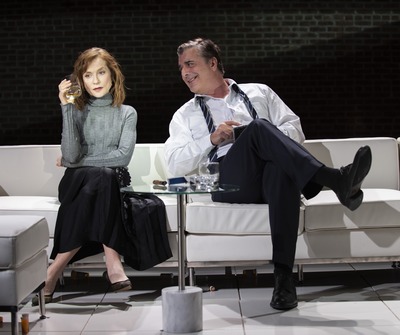 The Mother was written in 2010, four years before Zeller wrote The Father, for which Frank Langella won a Best Actor Tony in 2016. But where The Father is a heartbreaking study of the effects of Alzheimer's on a man and his family, The Mother is a study of clinical depression told in a series of scenes, replayed multiple times in different variations to the point where we don't what's real and what's not. Anne's entire life has centered on raising her children, a daughter and a son, but, 25 years later, her kids have moved out and are busy leading their own lives. They don't call. They don't visit. And, to make matters worse, Anne is convinced her husband's late nights and seminar weekends are evidence he's having an affair with his secretary . . . or worse. The audience watches Anne's imagination run away with her, but to what end? As Anne's husband Peter, Chris Noth is appropriately shocked and mystified by his wife's bipolar behavior. Their son Nicolas, a disengaged Justice Smith, appears the next morning having slipped in during the middle of the night after an argument with his girlfriend Emily, a savvy Odessa Young. But is Nicolas really there? Is Emily really his girlfriend? And is she really wearing the same red dress that Anne has bought herself in attempt to look young again? The only thing that seems real is Anne's wildly unhealthy obsession with her son evidenced by a surfeit of alcohol and pharmaceuticals, with the pill bottles of the later littering the sleek, modernist set courtesy of Mark Wendland. Ironically, Anne is totally dismissive of her unseen daughter, seemingly dooming her to the same fate she's now suffering. To be sure, where you sit in the Atlantic's intimate Linda Gross Theater will make a big difference in how much you enjoy Huppert's riveting performance. The closer and the more center you are to Huppert, the better. The further back or to the side, you'll strain to understand her. This is a shame because if you miss every third word, you're missing a third of the play. Effortlessly chic and captivating to watch, Huppert is a wonderful actress. But when she speaks rapidly, which she does frequently, she becomes almost impossible to understand. Aging mothers whose children ignore them have been fodder for writers and dramatists for hundreds of years. The Mother puts a fresh spin on it but I'm not convinced it's a spin that adds anything new to the conversation.