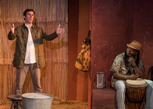 David has been steeped, to use one of his favorite words, in his story for more than twenty years. He recently published a book about his experiences in Africa, and he has received a note from a Rwandan named God's Blessing, who is a key figure in the account. The note simply reads, "There are untruths here." A good part of the seventy-minute monologue is an attempt to root out and resolve those untruths. We learn that David had gone to Uganda in 1994 as a Christian missionary. He admits that at sixteen years old his reasons for going were not based on high-minded pious beliefs, but out of puppy love. He was smitten with Mary, a young woman from his church, and for whom he would go to the ends of the earth. He was not in Africa long when he realized something was terribly, terribly wrong. Dead bodies were floating down the river from Rwanda, which was not far from the missionary village where David and Mary resided. Before he knew it, David, drawn in by Mary and God's Blessing, became an unwitting participant in the Rwandan civil war between the Hutus and Tutsis and an eyewitness to the genocide. The title of the play refers to the fact that the country's dogs had to be shot and killed because they were feasting on the slain victims. As is no doubt evident, David's chronicle is gripping, violent, and ultimately quite moving, and Hodge gives a riveting performance. As the emotionally traumatized character, Hodge appeals to the audience directly, not to seek our forgiveness for what he may or may not have done, but for us to actively receive his story. Hodge bares the depths of the character's pain effectively, and he convincingly shows that healing occurs in the telling of one's experiences. Hodge shares the stage with Abou Lion Diarra, a terrific West African musician. Playing a variety of percussion instruments, Diarra provides dramatic and thematic underscoring and punctuates some of the key moments with sound effects from found objects on stage. The accompaniment helps establish mood and setting, but more importantly Diarra serves as a powerful onstage presence and arbiter as he moves in and out of the action. The play, which is co-directed by Frances Hill and Peter Napolitano, is enhanced by its notable design elements. Scenic designer Frank J. Oliva evokes the starkness of an African plain with a dry dirt floor and visual references to the surrounding grasslands. The façade of a thatched hut suggests an African village that David sees as both a refuge and a trap. John Salutz's lighting is particularly evocative, offering a sense of the African sun with a warm orange wash and the puniness of humanity under a dark and vast, star-filled night sky. A large screen hangs above the stage, and Ryan Belock's projections onto the surrounding walls and screen contribute to the sensory impact. At one point a flock of birds in shadow fly over the scene, and at other times, segments of the text are reprinted above the actor. The effect heightens the feeling that the character cannot escape from his story, and the oppressive words hover above, threatening to crush him under their weight. I will admit I was a little uneasy about the piece when it began. There is something instinctively off putting about a white male character confronting the psychological torment of the Rwandan genocide. Indeed, African characters are relegated to supporting parts. In the end, though, Dogs of Rwanda shows that cultural scars are not limited by racial or national origins. We are all implicated in historical traumas by the narratives we hear and the stories we receive.