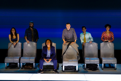 The actual title is the name of a real Amtrak train. The focus is on six passengers on the 36-hour ride between Los Angeles and Seattle. It is a risky idea for a play, a more-or-less plotless character study, but one in which a good many of the conversations we overhear among the characters apparently never actually take place, leaving us confused as to what to believe about any of them. Generally speaking, we accept that any play is a work of fiction, a product of the imagination of the playwright. We are expected to buy into whatever premise is placed before us. But it's hard to willingly suspend our disbelief when we are constantly fed lines like "if he had told me that, I'm not sure what I would've said," or "I wanted to tell her," or "that's exactly why I didn't say anything to you." But let's suppose that it is the audience that is most privy to everyone's thoughts, or at least to the thoughts of the presumptive narrator, T. J. (Will Harrison), whose opening words, "A few years back I took the Coast Starlight north to Seattle," suggest that this is one person's recollections about what for him was a time of a life-altering decision that coalesced during this journey. T. J.'s first imagined encounter is with Jane (Camila Canó-Flaviá), who is sitting with a sketchpad in her lap, quietly drawing some of the passengers, including him. Their story, as it enfolds in T. J.'s mind, becomes a sweetly romantic interlude as well as one of the paths T. J. will never be able to follow. Or, as he explains to us and justifies to himself in retrospect: "I realized I couldn't talk to her, because I couldn't tell her the truth about myself." As time passes, T. J. conjures up four other passengers: Noah (Rhys Coiro), a former soldier who did a tour of duty in Afghanistan and whose life has not been the same since; Ed (Jon Norman Schneider), feeling trapped in a job he hates; the kind-hearted Anna (Michelle Wilson), who is returning home after dealing with a distressing family crisis; and Liz (Mia Barron, a comic delight), who is escaping from a recently collapsed relationship and whom we first meet during a highly animated phone conversation that everyone aboard the train can overhear. Projected images representing flying-by scenery, along with seating arrangements that occasionally move about the stage into different configurations, help with the illusion that pretty much everything we see and hear exists only in the not-altogether-reliable recollections and invented conversations from the mind of the troubled T. J. But beyond that, there's not a lot for us to latch onto. Except for the unpredictable mayhem that is Mia Barron's Liz, the characters are not interesting enough for even Jane to want to sketch, and the 95-minute production of The Coast Starlight makes for a long train ride.