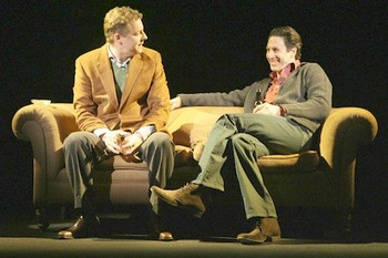 Magnify the picture a bit, however, and the situation changes. The paint-stripping suspense of humanity on an intimate scale doesn't always retain its astringency when writ large, even if the writer is an expert dramatist such as Caryl Churchill. In fact, judging by Churchill's latest at The Public Theater, Drunk Enough to Say I Love You?, the most estimable talents fall the hardest because they feel they have less to prove. Why go all the way when only half a journey will do? Calling Drunk Enough even half a play, though, is being considerate. On the script level, it's at best a dramatic exercise. But director James MacDonald elevates it closer to art with his first-class production, which grants it a humor and significance it hardly deserves. This staging is all that prevents Churchill's harangue from imploding under its own self-imposed weight. For the violently mismatched lovers it concerns are not people at all. Oh, a few minutes of nonsense declare that the American Sam (Scott Cohen) and the British Guy (Samuel West) are lovers, Guy is leaving his wife and family to keep house with Sam in America, and so on. But that's forgotten by the end of the first scene, when Churchill makes it quite clear that this pair represents something much bigger. Specifically, Sam is really the monolithic United States, and Guy is... well, that's open to debate. Just the U.K.? The civilized rest of the world? Sense and sensibility? Take your pick. All that matters is that these two move from passionate bedmates to persnickety bickerers as soon as pillow talk fades into subjects of international consequence. Sam can't wait to bomb everyone and enforce his concept of government on the world; he's also a fervent Global Warming denier, but will explode if second-hand smoke gets in his face. Guy, calm and endlessly patient, spends his days trying to convince Sam of the gaps in his logic, especially about the terroristic Israel Sam so openly supports. But Sam is just so magnetic, Guy can never stay away, no matter how angry he becomes. Thus, the codependency continues. But if Drunk Enough is merely the latest in the line of uncomfortable and unimaginative attacks against the Bush Administration's America, it's sharper and more theatrical than most. The interruptive, staccato dialogue prevents both Guy and Sam from even fully completing a single thought, and signaling the bone-deep incompatibility that both draws them together and divides them. Wondering whether the language will ever resolve itself into fluid clarity is the chief question (and pleasure) of the play. MacDonald richly highlights every isolationist theme by setting Guy and Sam's interactions on a couch floating (often literally) in a field of endless black; set designer Eugene Lee has helped MacDonald ensure the two men are truly alone in the universe. He's also flooded the stage with irony, ensuring that both men see - and can laugh about - the destruction into which both are plunging. This gives the play an originality and panache it otherwise lacks, and makes West's and Cohen's performances seem more useful than they are. Since neither man is playing a character in the traditional sense, there's not much to say about what they do: Cohen hits the proper buttons for a generic smarmy do-gooder, while West makes Guy into the epitome of elegant, tolerant frustration. Is it enough? Not really. This is ultimately a play that teaches you nothing and offers no emotional involvement whatsoever, making it a pointless excursion for those who like their theatre meaningful rather than just angry. When Churchill has chosen to operate in playwright mode rather than lecture mode, she's demonstrated her ability to impart messages with tact, creativity, and wit - her classic Cloud Nine chronicled the identity crises of a century of Britons, and even her recent A Number was a textured and surprising look at the intersection of technology and the human soul. But her message here is nothing more or less than "America is ruining the world," which - at least in this country - is always subject to debate. On these shores, it would almost certainly resonate more strongly as a three-hour suggestion than the 45-minute screeching screed it is. Drunk Enough to Say I Love You? is just another reminder that screams from mountaintops can fall into fizzles when whispers in the ear can raze cities.