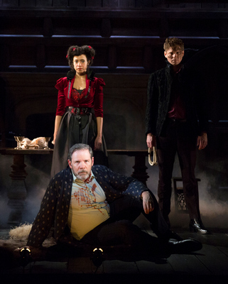 Subtitled "A True Crime Thriller," Arden is based on a real-life Valentine's Day murder in 1551. Although embellished, most of the historical figures and events surrounding the killing are represented in the play. Arden (Thomas Jay Ryan) is a wealthy and prominent landowner in Faversham. His wife Alice (Cara Ricketts), resembling a cunning and barbarous Lady Macbeth, is in a passionate love affair with Mosby (Tony Roach), a steward and former tailor. The two plot the murder of the gullible Arden, who is joined at the hip by his devoted friend Franklin (Thom Sesma). Also involved in the scheme is Mosby's sister Susan (Emma Geer), who is courted by the awkward and lovable servant Michael (Zachary Fine) and the pompous and poison-bearing artist Clarke (Joshua David Robinson). Through a combination of dumb luck, coincidence, and assailant ineptitude, Arden is able to evade several assassination attempts. In fact, for much of the play, he is blithely unaware he is being followed by a couple of bumbling hitmen, Big Will (David Ryan Smith) and Shakebag (Haynes Thigpen), who are hired by the conniving and revengeful Widow Greene (Veronica Falcón). (Some scholars suggest that Shakespeare was a co-writer, and the characters, although based on real people, Big Will–or, Black Will in the original–and Shakebag offer a tantalizing literary connection.) Directed by Jesse Berger, the production begins with a nod to film noir of the mid-twentieth century. The first scene is set in the parlor of a Tudor home (Christopher Swader and Justin Swader designed the cleverly adaptable set), and a man's 1950s fedora sits prominently on the heavy wooden table center. Alice, wearing an alluring white silk robe (Mika Eubanks designed the astute costumes) enters stealthily, and in Reza Behjat's moody and shadowy lighting, she slinks about the stage like Lana Turner in The Postman Always Rings Twice or Barbara Stanwyck in Double Indemnity. (Greg Pliska, who also composed the original music, and Nina Field are behind the evocative sound design.) As the play goes on, however, the intrigue is undercut by dashes of broad (and not particularly well-executed) slapstick comedy. The brilliance of a Coen Brothers film lies in the ways in which butchery, absurdity, and suspense are organic to the world they have created. Intermixing period and contemporary costumes, melodramatic and classical acting approaches, and tragedy and buffoonery, however, the world of Arden seems to be constantly shifting and it's unclear which world the characters exist in. The actors are clearly having a lot of fun, but the most effective scenes are those in which they do not play for the laughs or the gasps. Ryan, as usual, is terrific, and he is delightfully dim without being clownish. Ricketts is compelling in the femme fatale part, and in her escalating desperation to see her husband dead, she offers glimmers of humanity as she recalls the times when she was in truly love with him. Sesma gives a stalwart and moving performance as Arden's sidekick with his own obscured desires. Arden of Faversham is rarely done in the United States, and its mysterious authorial origins (which have also included Thomas Kyd and Christopher Marlowe) tend to eclipse its stageworthiness. Even a schizophrenic production like the current one, though, shows that this domestic tragedy potentially offers a bloody good time.