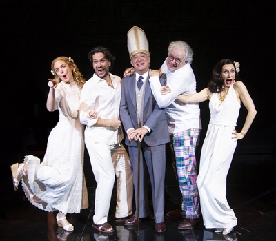 But Guare's latest work, opening tonight at Lincoln Center's Mitzi E. Newhouse Theater, a play that carries the actual title Nantucket Sleigh Ride, is less a deep dive into terra incognita than it is a quite funny and surprisingly heartwarming memory play. (For the record, an earlier version of the play, then called Are You There, McPhee?, was produced at Princeton's McCarter Theater in 2012.) Granted, the memories that arise do so amid flights of fancy randomly pouring from the burbling mind of the main character, Mundie, a playwright-turned-Wall Street broker, depicted by a charismatic John Larroquette. We join Mundie as he embarks on a journey that takes him from Manhattan to Nantucket to find something he has lost within himself back in the 1970s when he was the golden boy writer of his one successful and popular play. He has been in creative lockdown ever since, hence his career switch to a job he describes as "convincing people to sell things they love to buy things they don't want." In true Guare fashion, along the way Mundie has a run-in with a hefty lobster, gets implicated in a porno ring, becomes a surrogate father to a couple of temporarily abandoned children (Adam Chanler-Berat and Grace Rex), and meets up with his idol, Argentinian surrealist writer Jorge Louis Borges (Germán Jaramillo), as well as a deceased and cryogenically frozen but still chatty Walt Disney (Douglas Sills). Other bits of the puzzle that emerge from Mundie's unreeling mind include references to the movie "Jaws," a screenwriting job for Roman Polanski, cameo appearances by Jane Fonda and Robert Redford, and a treasured and valuable collection of children's books. So, yes, a tad unusual, but in its own way, logical, the way that Tom Stoppard brings logical explanations for the behavior of his characters in such plays as After Magritte. It's quite a parlor trick, and Guare manages it with great artistry and an altogether praiseworthy amount of control. Happily, director Jerry Zaks also does a wonderful job of keeping the entire enterprise floating on air as the story unfolds farce-like on David Gallo's set, designed to look like three tiers of doors, most of which slide open as a group to reveal the oddments that pop into Mundie's mind at any given moment. Larroquette exudes charm by the bucketful, and the rest of the cast make for a delightful ensemble, so much so that the whole play feels grandly choreographed. The other cast members are Jordan Gelber as Mundie's attorney, Will Swenson as the enigmatic McPhee, and, in multiple roles, Stacey Sargeant, Tina Benko, and Clea Alsip. Certainly, Nantucket Sleigh Ride bears a Guareish phantasmagorical quality. But if you allow the plot to unravel of its own accord, you'll find that the ride is fast and fun and tenderhearted without triggering any sort of mental whiplash.