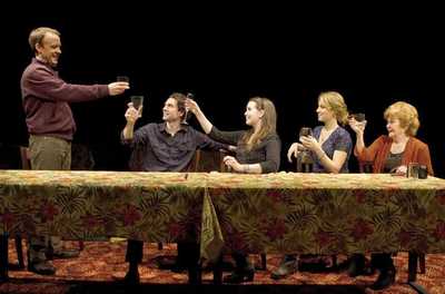 How do all these convolutions resolve themselves, you may ask? More easily than you might think, given that LeFranc has scripted this deceptively simple work to within an inch of its (outstanding) actors' lives, and Sam Gold has directed it with clarity and precision that rival those of his best work in his still-burgeoning but already estimable career (including Circle Mirror Transformation in this same space in 2009). Together the pair frees your mind from worrying about the seemingly impossible task they've achieved: crafting an epic saga of 80 years in the life of a single family, with only nine performers playing 20 separate charactersat each age and every stage. Think of it this way. There are three central actresses: Phoebe Strole, Jennifer Mudge, and Anita Gillette. Strole plays characters from age 10 to about 30, Mudge from 30 to 50, and Gillette from 50 onwards; Rachel Resheff also occasionally steps in when a very young girl is required. This means that any given character may be played by two or three actresses, with the others simultaneously occupying the satellite roles that surround her. For example, Strole begins as a woman named Nicole, who begins dating a man named Sam. They're together for a while, then split up; they reunite years later, with Mudge now Nicole. She eventually has a daughter named Maddie, whom Resheff starts and then passes to Strole; later on in the show, Gillette has assumed Nicole and Mudge is Maddie. Four male actors (in chronological order: Griffin Birney, Cameron Scoggins, David Wilson Barnes, and Tom Bloom) do the same for the men. Throughout 90 exhilarating minutes, everyone trades off, becoming everyone else's grandparent, parent, child, cousin, and even boyfriend or girlfriendand yet it's all written and staged so elegantly that you never lose track of who is who. Any number of magical moments unfurl along the journey; my personal favorite was Sam and Nicole tussling with a pair of bratty kids and then, instantaneously and absolutely obviously, playing lovingly with their own children. Though every scene is set in some sort of a restaurant, the design contributes no confusion or excess of its own: David Zinn, who also did the costumes, uses only four tables, a collection of chairs, and a stage-spanning banquette to thrust us into any time and occasion. It's the simplicity that energizes these effects, and few current directors handle that better than Gold. Nearly every moment onstage is a triumph of understatement, with no noise and no movement ever wasted. These people are, in any configuration, a family, and show it in the ways they wield joy, resentment, boredom, and everything else in between. All the performers are outstanding, but Mudge and Gillette sparkle just a bit brighter: the former because of how she captures an intense panoply of nonspecific cultural change, and the latter for how she integrates every event into a single straight-ahead package. Mudge invariably plays the self-directed firebrand with the habit of growing into the conservative woman determined to avoid making wavesit's a delicious setup that Mudge and Gillette execute flawlessly. You may be expecting that The Big Meal falters because it couldn't possibly do all of its characters justice in such a short time, yet that's not at all the case; the relay-race style, coupled with all the actors' constant presence onstage, informing the action throughout, gives luxurious focus to everyone. No, the trouble is that, with all the extra time it has, the play doesn't have much of anything interesting to say about anyone in the family or what they're going through. With the exception of Sam's mom having invented Cadillac Margarita (that's a regular margarita with a splash of Grand Marnier), we learn almost nothing about anyone. This person has a sister, this person gets sick with this disease, this person is a serial dater, this person joins the military, okaybut little of it cuts deep, and none of it is vivid. If LeFranc's intent with the people was, as with the restaurant setting, to show that these people could be any people, then he's gotten his wish. But the generalities grow wearying after a while; because you track so many members of the family for decades, you should come to know or care about them in concrete ways, and neither happens. If not for the actors and Gold, there'd be nothing transcendent about the evening at all. True engagement demands details, and absent them you may as well be watching a silent film farce. The only times you're truly drawn in are the times the ninth character appears. The waitress, played with a captivating but mysterious stiffness by Molly Ward, is in true control of the proceedings, and her appearances with plates of food become the fulcra around which the rest of the action ultimately revolves. To say more about what she does would be to give away The Big Meal's most delectable surprise (and most haunting stagecraft), but let's just say that no one would be there without her. If the problem is that too often it seems as though no one's there anyway, it's almost forgivable given how resplendently everything else has been prepared. If indeed you eat with your eyes first, neither LeFranc nor Gold has anything to worry about. But when it comes time for your teeth, you can't help but wish they more frequently had something substantial to bite into.