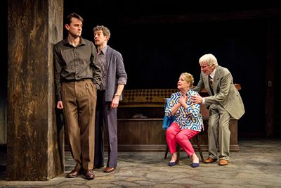 It does offer one ingenious stage device–one that it's surprising more playwrights haven't employed, and one that might have suited Eugene O'Neill's Strange Interlude better than all that single-character double-talk. The protagonist, Gar O'Donnell (David McElwee), is indeed headed for Philadelphia tomorrow morning, escaping a dreary small-town existence in Ballybeg. Gar isn't that articulate, and he tends to censor his interior thoughts lest the Ballybeg residents be offended or angered. So Friel serves us up a second Gar, billed as Gar-Private. He verbalizes those silent thoughts while sparring with the real Gar (Gar-Public), trying on American accents he learned at the movies, and singing and dancing with the glee and abandon the real Gar wishes he had. What better way to depict a protagonist completely, interior and exterior versions? A.J. Shively, lately wonderful in Paradise Square on Broadway and A Man of No Importance off-Broadway, brings his musical-comedy chops to Gar-Private, and they're invaluable. His comic timing is aces, and he enlivens the action, of which there is not a great deal. Friel specialized in soul-of-Ireland plays, abundant in historical and political context, and this one's more personal and less social-comment than usual. There's the implicit editorializing on the static economy and Catholic-Protestant clash of the Irish hinterlands in 1962, but mostly we're dealing with a generic sad young man trying to shake off his soul-deadening surroundings. Gar, whose mother passed shortly after birthing him, is 25 and in a rut. He's attended to by a longtime housekeeper, Madge (Terry Donnelly, scowling, shuffling discontentedly, and stealing most of her scenes), and works in the general store owned by S.B., his dutiful, dour, inexpressive father (Ciarán O'Reilly, who also directs). He recently wooed the willing Katie Doogan (Clare O'Malley) but swallowed the crucial words at a crucial moment, sending her into the arms of a wealthier rival. An opportunity arrives with a visit from Gar's Aunt Lizzy (Deirdre Madigan, resplendent in costume designer Orla Long's hilarious 1960s ensemble), a lively, vulgar Philadelphian with her cowed, practically silent husband Con Sweeney (Patrick Fitzgerald) in tow. Lizzy, childless and not happy about it, invites Gar to Philadelphia and finds him employment at a hotel, a chance to leave his placid environment and reinvent himself. Will he accept? Public and private Gar argue about it a bit, but is there really any doubt? The conflicts, then, are minimal; mostly, Philadelphia, Here I Come! is slice-of-life. It's the sort of play whose mid-century economics allowed plenty of subsidiary characters who don't affect the outcome much: Gar's old schoolmaster, Master Boyle (Fitzgerald again); Ben, a well-off American friend of Aunt Lizzy's (Peter Cormican); Katie's intimidating politician father, Senator Doogan, and the local canon, Canon OByrne (both Ciaran Byrne); several drinking buddies of Gar's (Emmett Earl Smith as Joe, James Russell as Ned, Tim Palmer as Tom), whose aimless palaver about girls and booze takes up a goodly part of the second act. (Friel's stage direction: "Tranquility is their enemy. They fight it valiantly.") There are compelling side stories: Madge's delight and eventual disillusion over her new grandniece, Gar's sense of loss at never having known his mother, his memory–or did he dream it?–of the one idyllic day he shared with his father many years ago. These inspire some of Friel's most lyrical writing, and there's tension in the face-off between O'Donnell pere and fils: Will they ever have a decent, soul-baring conversation? Unfortunately, they don't. But much of the language is lovely, and O'Reilly's fluid direction allows the actors, strategically placed on Charlie Corcoran's too-modest set, to shine. O'Reilly in particular makes a meal out of S.B., a nonentity carrying unspoken reserves of regret and affection, and McElwee's guarded Gar-Public is a suitably awkward counterweight to Shively's ebullient Private one, a walking id who also gets most of the good lines. O'Malley is a conventional ingenue until a trenchant, well-played scene where she pops up to wish the departing Gar well and gets more than she bargained for. Such good moments make one wish for more heft, more heat, more size: Friel's play is pleasant and atmospheric, but it remains rather slight. Philadelphia, here he comes! Then he goes. The end.