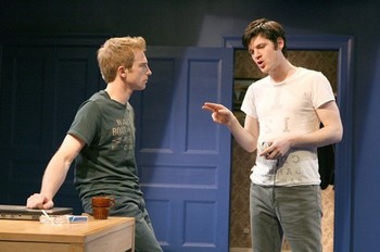 So it's difficult to know how to approach Itamar Moses's new play The Four of Us, which just opened at Manhattan Theatre Club, other than to say it's no Citizen Kane. (For you youngsters in this play's target demographic, it's also no Fight Club.) Despite being attractively staged (by Pam MacKinnon), Moses's novel-gazing exercise alternates between intermittently amusing and downright tedious until the penultimate scene. That's when the world shifts and head-scratching, nervous laughter, and pensive looks take over. You don't, however, get what you need most, the thing that separates truly effective twists from garden-variety gimmicks: a deeper understanding of all that's come before. What begins as a flimsy chronicle of two writer friends unable to cope with each other's achievements also ends as such, albeit with the dubious added value of an explanation for the stilted writing and wooden acting that plague the production. (Whoops, I almost gave something away there.) The story follows fiction writer Benjamin (Gideon Banner) and playwright David (Michael Esper) from their first meeting as 17-year-olds in music camp through college, a summer in Europe, and their early attempts at establishing their careers. One is successful early while the other continues to struggle, though of course the one who found easy fame has had an equivalently bumpy road of a different sort. Good intentions go awry, good feelings go bad, and good friends go separate ways - only to reunite when it's most important. The pervasive shallowness of this, intertwined with a less-than-scintillating condemnation of the commercial aspects of the literary world, is not alleviated by Moses's ordering scenes to tell the entire story and then fill in all the gaps, whether or not they need it. That they invariably do not results in a 95-minute play with, at best, 45 minutes of story and an atmosphere of chronic repetitiveness: By the time Benjamin and David get around to saying all the things they earlier said they said, you've long progressed past needing to hear them. Those scenes, set earlier in the chronology, are also hampered by the performers' arch heaviness. Banner's and Esper's jaded, detached outlooks make them moderately believable in scenes set in Benjamin and David's late 20s, but don't make them convincingly idealistic kids. Episodes from their college years, one of which includes a protracted sex demonstration with an oversized stuffed bear, are too awkward for the actors to achieve the play's goals of showing us what these talented boys lost on the road to manhood. Or are they? That Banner and Esper never tap into their characters' darkest recesses to inform their portrayals could just be an elaborate and unwinking realization of that crucial late-show turn. As could Itamar's constipated dialogue, which frequently includes lines like, "Oh, not, don't get me wrong, not you, like, exceed me in all things, or whatever, just, mainly, because envy is kind of not your style, you have this remarkable self-possession, it's one of the things that makes you a seductive friend, you rarely seem to need anything. From outside yourself." Unfortunately, the way this relates to the twist can't really be discussed here. Nor should the title, which offers a major clue, but is loaded with enough other safe interpretations so it doesn't give away too much. Moses has managed an astonishing act of cleverness not suggested either by his writing here, or in his frustratingly unfunny 2005 debut play, Bach at Leipzig: complete critical immunity. The story, the dialogue, and the acting are all so wrapped up in that one knot of plot that there's practically nothing that can safely be said about The Four of Us. That's only fitting, given how little the play itself says about anything.