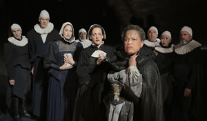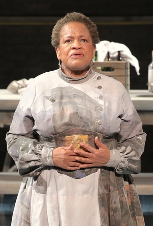 The outstanding nine-person ensemble makes one almost forget the excellent film adaption, which won the Oscar for Best Foreign Language Film in 1987. Set in Berlevåg, an isolated village in the farthest reaches of Norway, the story focuses on two pious and charitable sisters, Martine (Abigail Killeen) and Philippa (Juliana Francis Kelly), who live with their father, a staunch Christian ecclesiastic. The sisters each have short-lived love affairs, Martine to a young military officer and Philippa to an opera star, but when their father dies, they resign themselves to a life divested of earthly pleasures. The second half of the play takes place fifteen years later with the arrival of Babette (Michelle Hurst, best known for her work on "Orange is the New Black"), who is a refugee of the Paris Commune rebellion of 1871. She is a mysterious woman, who had been arrested as a Pétroleuse, someone who set fires to houses during the unrest. We learn that she has been sent by Philippa's opera beau, Achille Papin (Steven Skybell), who suggests the Frenchwoman live with the sisters. In his introductory letter Papin casually remarks (in one of the all-time great literary understatements), "Babette can cook." Fortuitously, Babette has come into a small fortune, and she requests that she be allowed to prepare a sumptuous French dinner for the hundredth birthday celebration of the sisters' deceased father. The final section of the play is a gourmet's fantasy as we watch Babette gather the ingredients, then chop, whip, and mix them all into a life-changing banquet. Running about ninety minutes in performance, the play (which was conceived and developed by Killeen and written by Rose Courtney) feels a tad overcooked, particularly in some of the earlier sections. Still, there is much to savor from the performances under Karin Coonrod's resourceful and often highly inventive direction. As the sisters, Killeen and Kelly are a lovely pair, and they exude strength and dignity in their devotional commitment. Hurst's Babette is a formidable and fascinating creation. As the self-proclaimed artist, Babette is an enigmatic woman, and Hurst imbues the character's dedication to fine cuisine with the equivalence of religious fervor matched only by the sisters' quite asceticism.