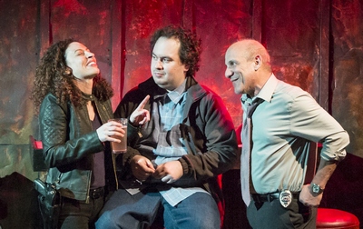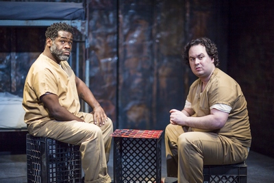 Perp begins with the interrogation of Douglass (Ali Arkane), a naïve young man with an apparent cognitive disability. Detectives Jack (Tricia Alexander) and Harvey (Paul Ben-Victor) are investigating the rape and murder (or is it murder and rape?) of a young woman. Since Douglass spends a good deal of time collecting bugs in the woods where the homicide took place, he is a likely suspect. Although Douglass seems to be completely incapable of committing such a heinous offense, the detectives convince him to confess to the crime. If he is convicted and goes to prison, their reasoning goes, the actual rapist/murderer will likely strike again, thereby allowing for the detectives to apprehend the real perpetrator. As a consequence, Douglass will be hailed as a national hero, and garnering massive public approval, he will receive a key to the city. Douglass cheerfully goes to prison to help his new detective friends, and he quickly bonds with his anti-Semitic cellmate Myron (Craig Mums Grant) over games of checkers and tales of the Old West. Meanwhile, the killer continues to rape and murder victims, but Jack and Harvey do not respond to Douglass's calls for release. Myron, intending to make amends for his own bad deeds, conceives a plan to help Douglass escape, which involves a benevolent and easily corruptible prison trash man. Back in society, Myron explains, Douglass could potentially capture the perp and bring him to justice. Best known for his play Orphans (revived on Broadway in 2013), Kessler has written a modern-day parable. Actually, Douglass has a saint-like quality, and he has a tendency to speak with biblical rhetoric. Summing up his view of humanity, he explains: "I believe there is Good and there is Evil. And God casts a light upon the Good. And without this light we would be overtaken by darkness and the world we live in would break away from the sun and fall into deep dark space." In fact, thanks to Marika Kent's lighting design, Douglass occasionally emits his own literal luminosity. (Edward T. Morris's scenic design and Kristin Isola's costumes help establish the stark and cheerless milieu.)
