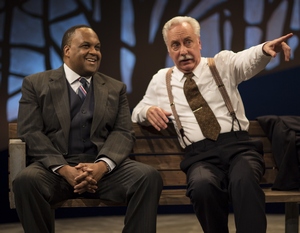 This is the third production of the play I have seen. In the original Broadway production Robert Prosky and Sam Waterston played the dueling Soviet and American diplomats, and in the Keen Company's slightly rewritten revival in 2014 the parts were played by Kathleen Chalfant and Paul Niebanck. The Barrow Group cast includes Martin Van Treuren as Andrey Botvinnik (the Soviet) and K. Lorrel Manning as John Honeyman (the American). The plot is generally straightforward. In brief, the two men meet four times over the course of a year (once during each season) in order to devise a possible nuclear arms agreement between the two countries. Away from a sterile boardroom and out of distance from a prying press, the two men are able to chat more honestly and personally in a forest clearing near Geneva. Discussion between the two men moves from nuclear threats and political posturing to country music and favorite colors. Therefore, the central question is as much about whether or not the men will reach an arms agreement as it is about might or might not a full-fledged bromance develop. More so than the other times I have seen the play, I was reminded of Samuel Beckett's Waiting for Godot. The characters seem comparatively alone in the universe while at the mercy of larger forces (that are always unseen but in complete control of the world's destiny). Blessing even seems to quote Beckett when near the conclusion he has Botvinnik ask his associate, "Shall we go back?" They do not. Whereas Godot takes place in a post-apocalyptic world, A Walk in the Woods paints a precarious condition in which Armageddon is always a failed mediation away. Addressing mankind's absurd and perverse desire to eradicate itself, Honeyman says, "If we fail now, history itself will disappear." Under Donna Jean Fogel's unfussy direction, Van Treuren and Manning bring, for the most part, admirable restraint to their roles. There are glimmers of optimism throughout, but the overall sense is wistfulness and quiet resignation. Van Treuren's Botvinnik is less cuddly and misleadingly obtuse than Robert Prosky's take on the character, and his is not as deceptively (and hilariously) manipulative as Kathleen Chalfant's interpretation, but he successfully mines the part for suitable humor and pathos. As Honeyman, Manning holds his own in the far less showy part, and his frustration with his intractable consort builds effectively. His blow-up scene, however, is a bit too big and does not reflect the well-practiced and ingrained reserve of the character. The play certainly speaks to audiences today, and amid the noisy and noisome political climate, perhaps it is advisable to take in a mild and reflective play every now and then. After all, in Blessing's open-air, forested setting the only tweets come from the birds.