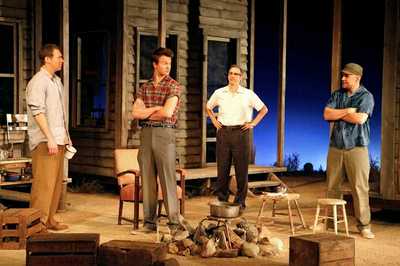 Each of those plays corresponds, not so coincidentally, to one of the major characters in this mid-20th-century look at camaraderie and conviction under fire. All of them occupy some crucial space on a Nevada divorce ranch in 1954, where men looking to end their marriages can arrange to spend six weeks in exchange for legal authorization to walk away from his wife. First up is Mrs. Duke (Adriane Lenox), the black woman who manages the ranch, even though there's some real question as to how she attained that power. Then there are the men themselves: Ben (Brian Hutchison), the longest-serving resident and the de facto leader; Gerald (Lucas Caleb Rooney), a former military man; Alvin (Richard Topol), who's pure nerdy milquetoast; and Caleb (Ansel Elgort), the newest arrival, so innocent and unspoiled of look that he barely seems of marrying age in the first place. Last but not least is Chrissie (Alexis Bledel), a young "working girl" from town who knows the ranch is the best place to find clientele (and a means of escape from her abusive father). There's a lot of nascent heat here, and it's fanned in the opening scene that finds Mrs. Duke introducing Caleb to his new surroundings and neighbors. (The set has been designed with simple frontier flair by Rachel Hauck, the warm and dusty lighting by Ben Stanton, and the straightforward costumes by Ilona Somogyi.) The boy is nice but unprepared for everything he experiences, whether living alone or facing down questioning from Ben, who can seemingly tell everything about a man from a single handshake. Caleb is not forthcoming about his past or the woman he's left behind, something that rankles Ben, who has plenty of his own secrets. Yet somehow they all manage to bond: over outdoor-cooked dinners, late-night card games, and a shared appreciation for Chrissie, though she only has eyes for Ben and only Gerald shows more than a skin-deep affection in her. Charman sets up, and director Carolyn Cantor carries through those opening scenes, the notion that the play will be about shifting definitions of marriage, manhood, and race in post–World War II America, and the characters remain sufficiently varied constructs that forward this goal. The interactions between the men, all of whom display very different relationships with love (Gerald gets there through physical intimacy, Alvin remains passionately devoted to his disinterested wife, and so on), fuels a fineif seldom dazzlingfirst act that suggests big fireworks and bigger changes to come post-intermission. What we get instead at the end of the first act is the arrival of a mysterious agent (Curt Bouril), who's determined to bring one of the men to justice (or at least to light) on behalf of the government, a development that bleeds through until the final scene. In doing so, it obliterates our ability to see these interesting folks live up to their potential, or even fill out the boundaries Charman spends his opening scenes establishing. Once the only questions under consideration are "What impact will this plot device have on one man's life?" and "How will the others react to it?", Regrets becomes annoyingly formulaic and painfully preachy, never settling for an original thought where a cliché will do. The ending in particular, which Charman apparently intended as a triumph over faceless adversity, strains so hard for profundity given what precedes it that it's almost comic. But the abandonment of so many hinted-at avenues for true, serious engagementwith Chrissie and Mrs. Duke the most tantalizing possibilitiesmakes this late-show about-face anything but a laughing matter. With the exception of Elgort, who reads as little more than hollow because he doesn't bring enough emotional shading to compensate for his underwritten role, the actors satisfactorily meet their challenges early on. Hutchison projects an absolute but uneasy authority that instantly brands him as the mayor of this community; and though Rooney is hampered a bit by Gerald's standard-issue redneck treatment, he locks into the man's blood-level drives for drinking and romance in believable ways. Topol overplays Alvin's societal aversion but displays real heart, as does Bledel in a role that could too easily become a cloying device rather than the real, aching woman this actress lets her be. Lenox smoothly blends Mrs. Duke's caring and comedy into a single smoky personality you'd really like to get to know better. Of course, that's true of everyone here. They obviously have rich stories to tell and convincing reasons to tell themthey're just not given a chance. Charman's decision to make a sharp left turn toward the political, and the well-trod (let's just say the secrets do not exactly make headlines in this country) would only work if he didn't get to his final destination by abandoning the people he's so lovingly created. He gives no reason why they can't move intact in this new direction, they merely don't. That ensures that Regrets ends up inspiring as many regrets about its lost opportunities as its earliest scenes do hopes for the promise of what's to come.